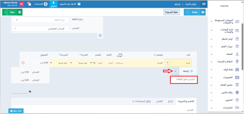 في قسم البنود، اضغط على السهم بجانب زر “إضافة” واختر “نسخ من جدول البيانات”.