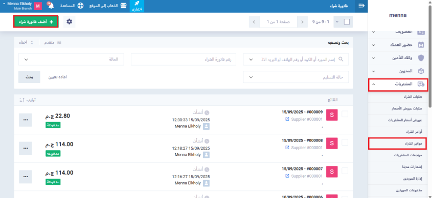 من القائمة الرئيسية، انتقل إلى “المشتريات” ثم “فواتير الشراء” واضغط على “أضف فاتورة شراء”.