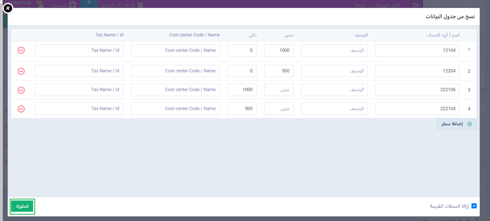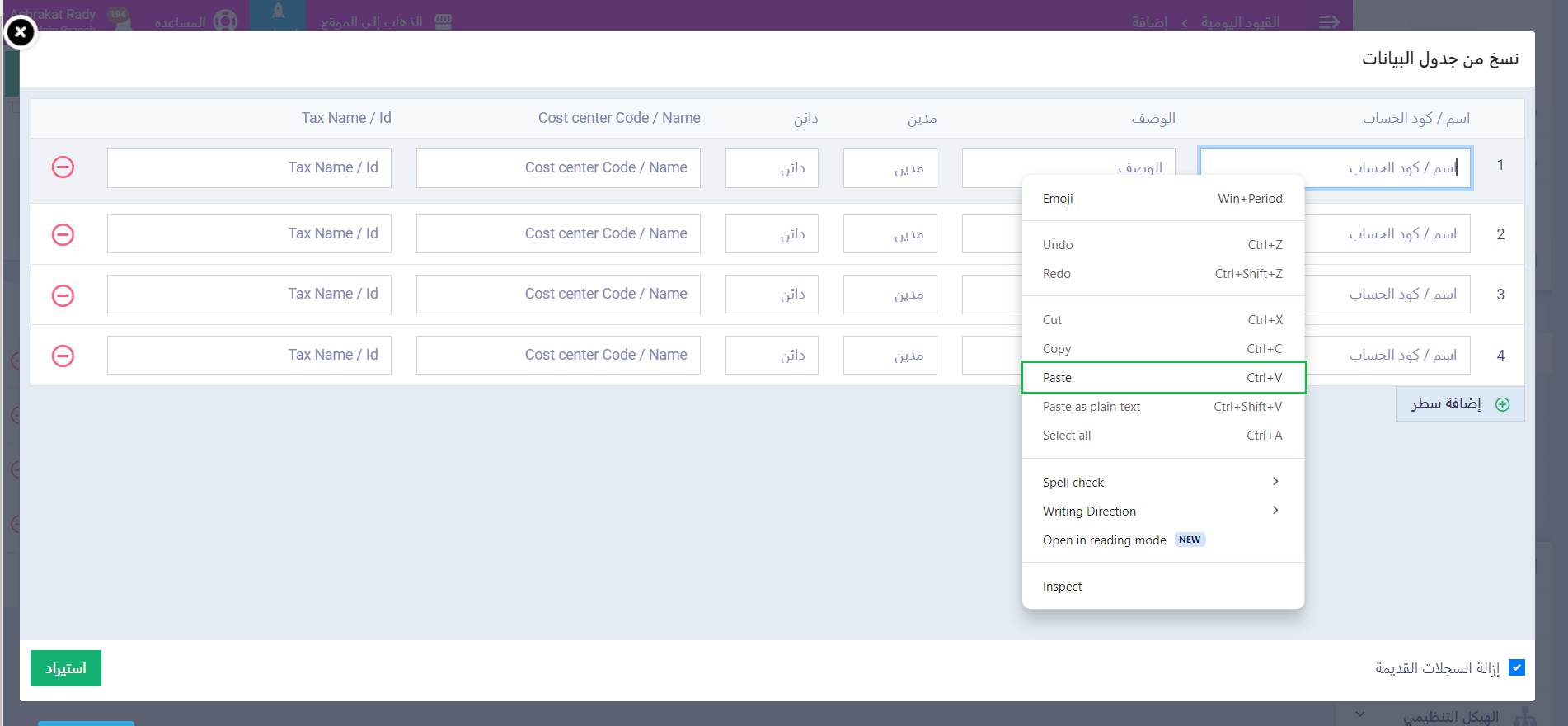 بمجرد الضغط على لصق نتأكد من إضافة كافة بيانات القيد، ثم نضغط على “استيراد“.