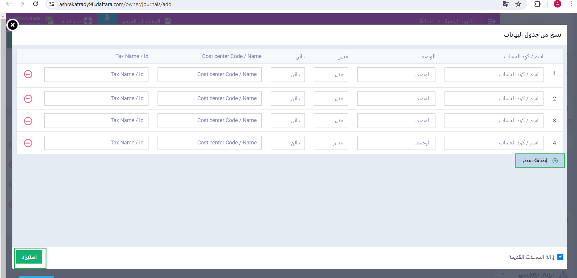 استيراد البيانات إلى شاشة القيد