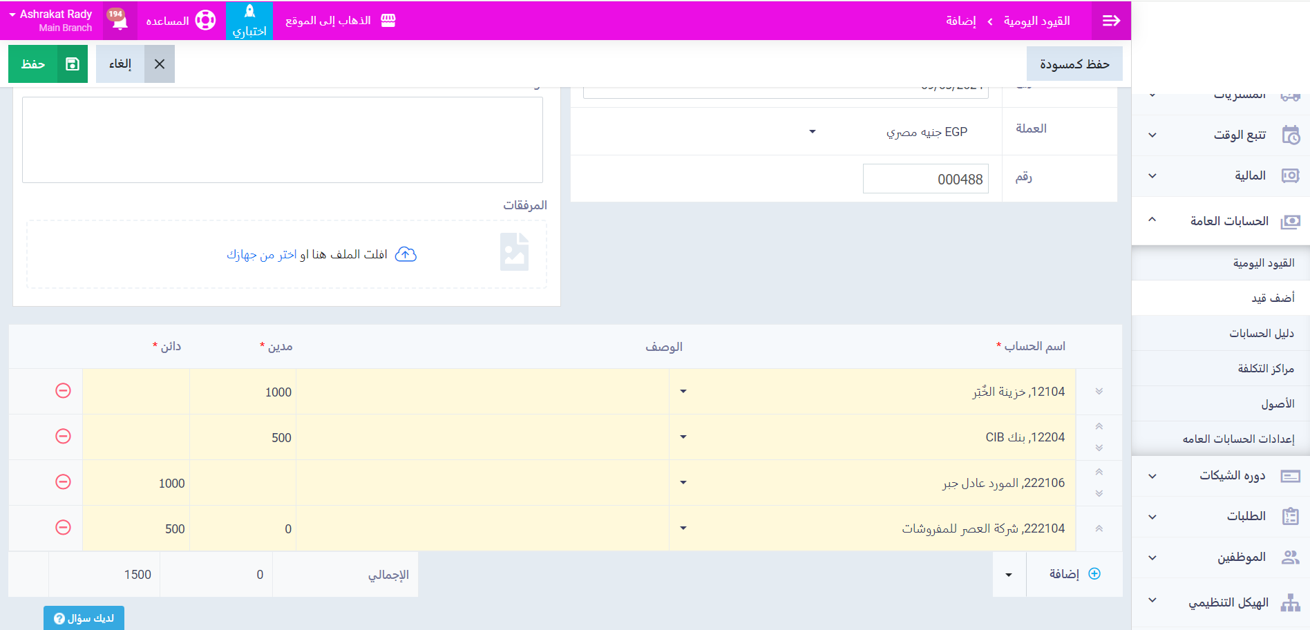 اضغط على “أضف قيد“ من القائمة الرئيسية واختر “الحسابات العامة“.