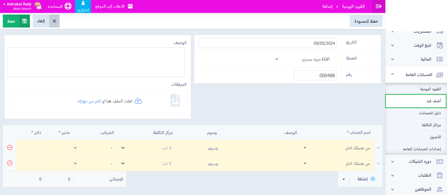 اتخذ الخطوات العادية لإنشاء قيد جديد، وذلك كالآتي: