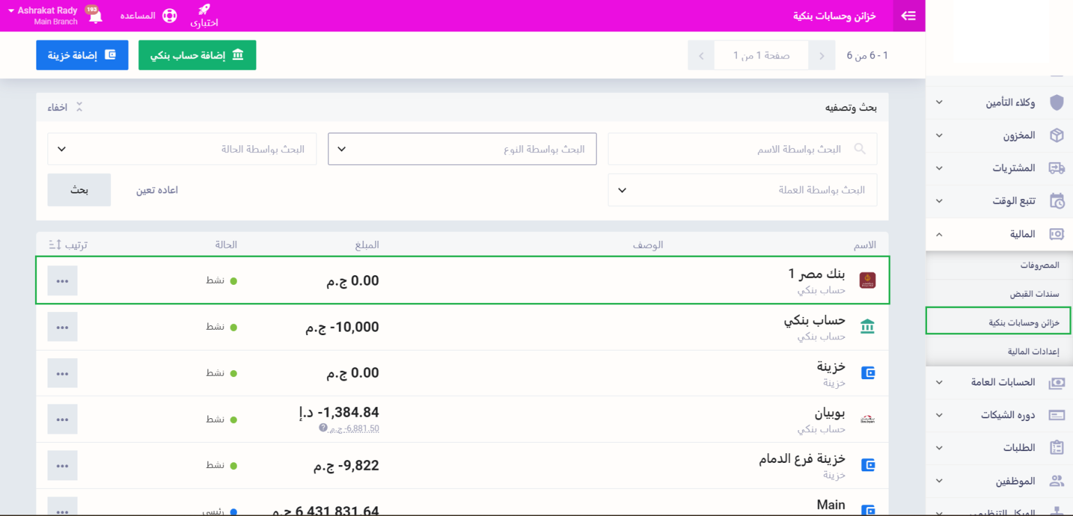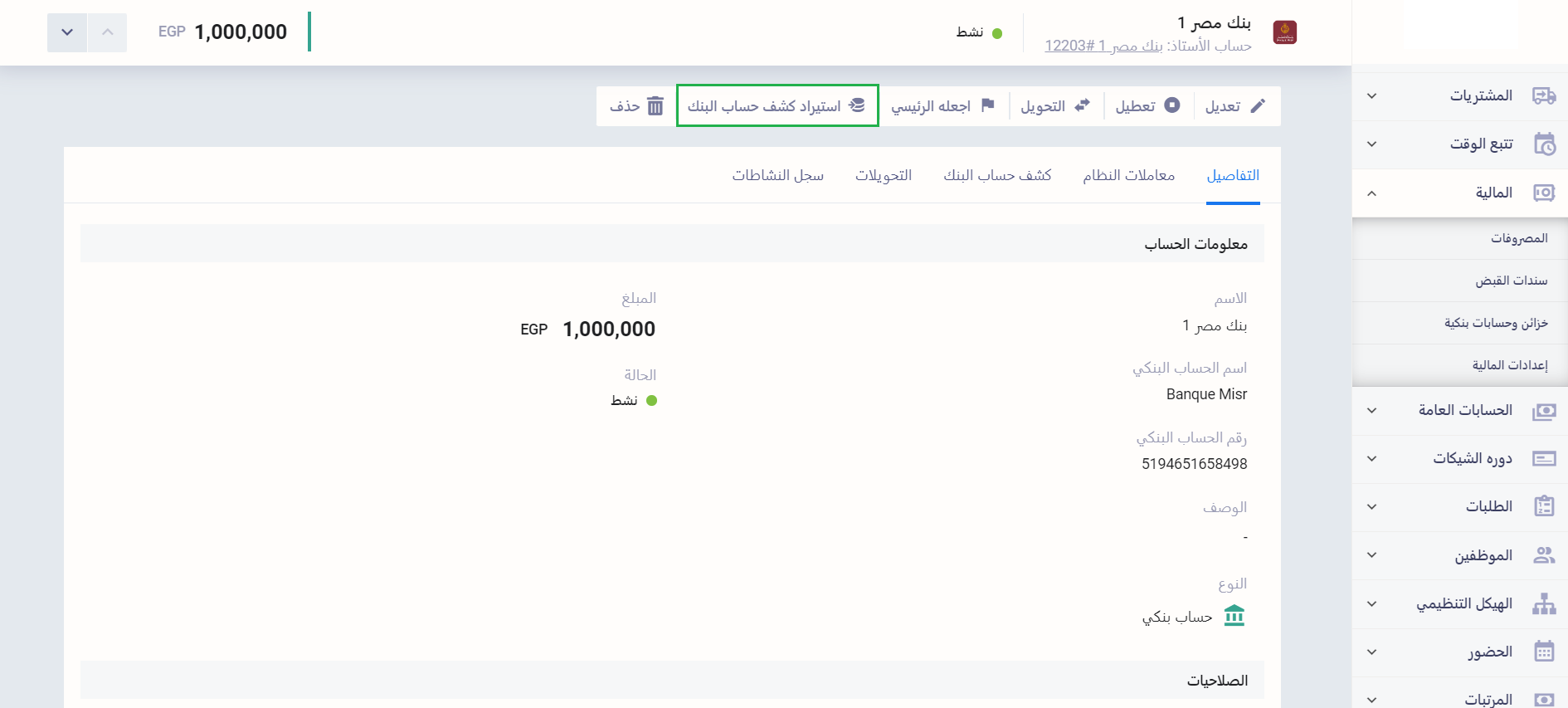 اضغط على “خزائن وحسابات بنكية” المنسدلة عن “المالية” بالقائمة الرئيسية، واختر حساب البنك المراد استيراد المعاملات الخاصة به .