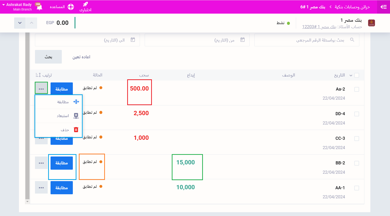 تظهر معاملات سحب الأموال باللون الأحمر بينما تظهر معاملات الإيداع باللون الأخضر، ويمكنك الضغط على زر “مطابقة” لربط معاملات ملف الإكسيل (معاملات البنك الفعلية) بتلك المسجلة على الحساب.