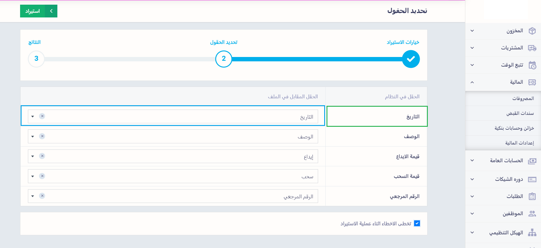 عند تفعيل حقل “تخطى الأخطاء أثناء عملية الاستيراد” لن يتم إظهار أي أخطاء حدثت عند عملية الاستيراد أما في حالة عدم تفعيلها سيُظهر لك النظام هذه الأخطاء لمعالجتها.
