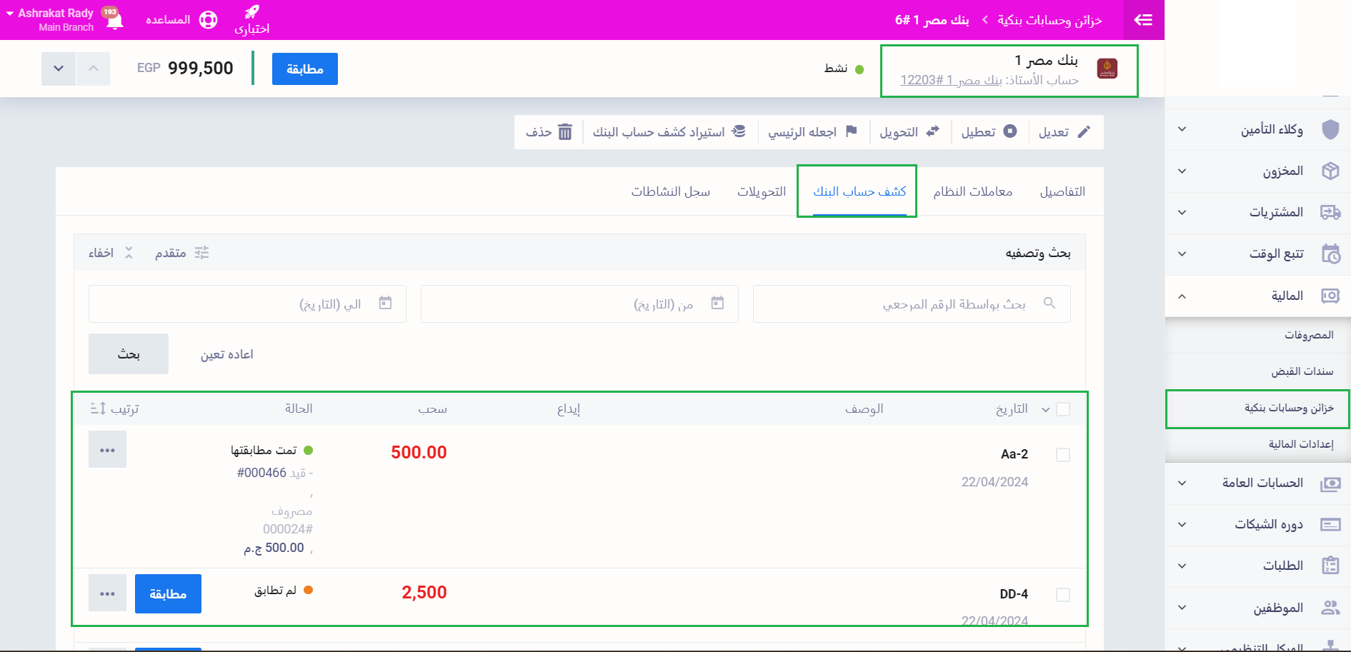 بعد استيراد كشف حساب البنك، اضغط على “خزائن وحسابات بنكية” المنسدلة عن “المالية” بالقائمة الرئيسية ثم اضغط على الحساب البنكي المراد مطابقته بملف كشف الحساب، واضغط على تبويب “كشف حساب البنك” لتظهر لك كل المعاملات التي تم استيرادها من ملف الإكسيل، لكن ستظهر بالحالة “لم تطابق” لحين مطابقتها أنت بنفسك يدويًا مع المعاملات الموجودة على حسابك بدفترة.