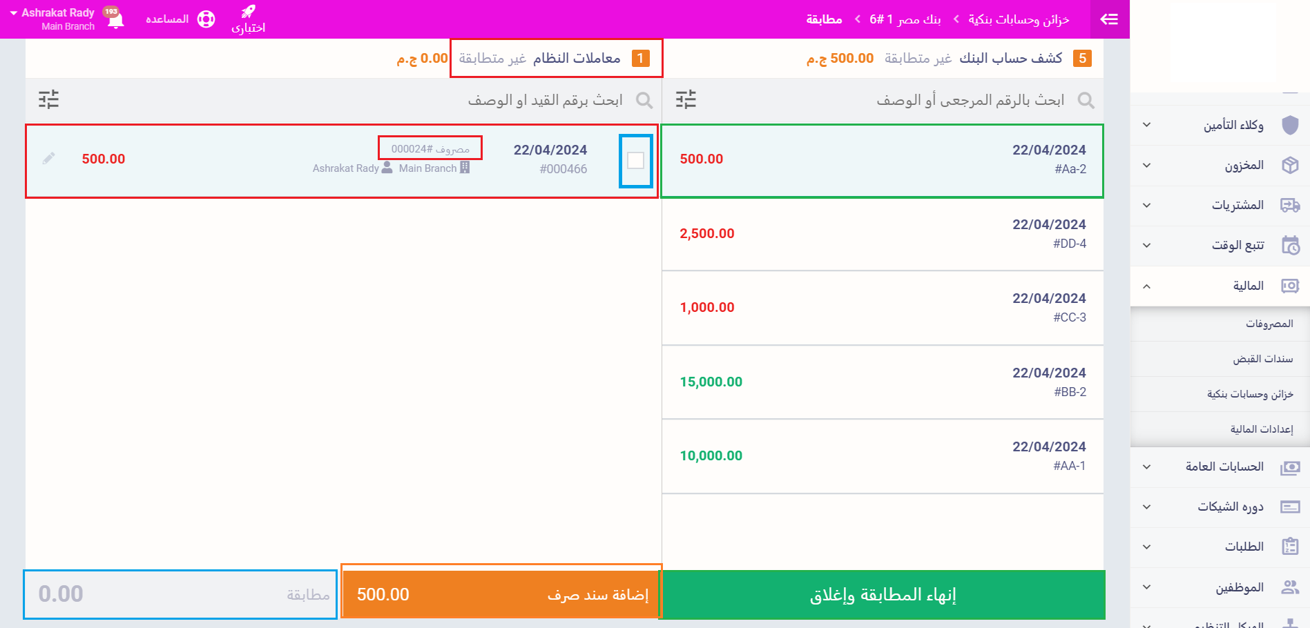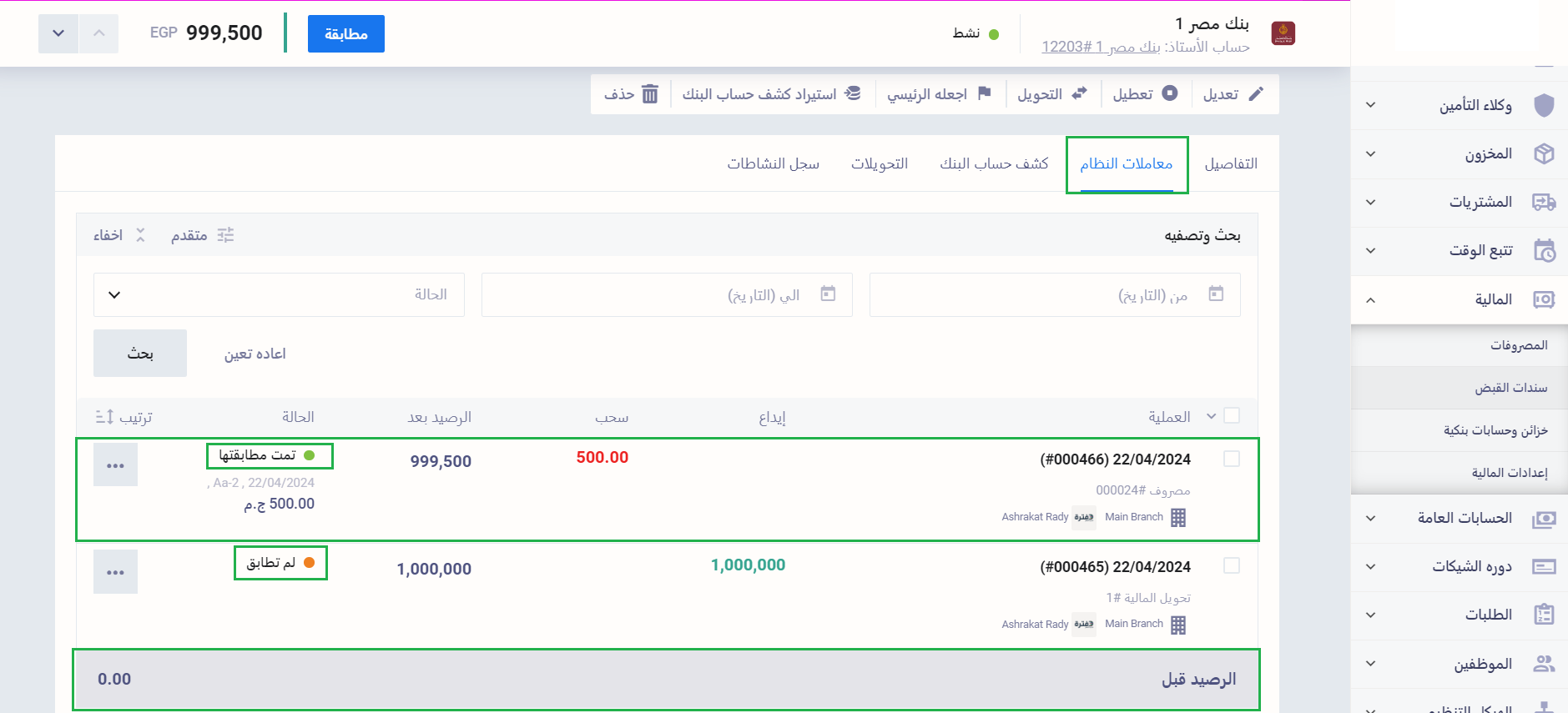 ملحوظة: إن لم تجد معاملة مماثلة على النظام لمعاملة الحساب البنكي، اضغط على زر “إضافة سند صرف” أو “إضافة سند قبض” وأضف المعاملة على النظام يدويًا ثم قم بالمطابقة.