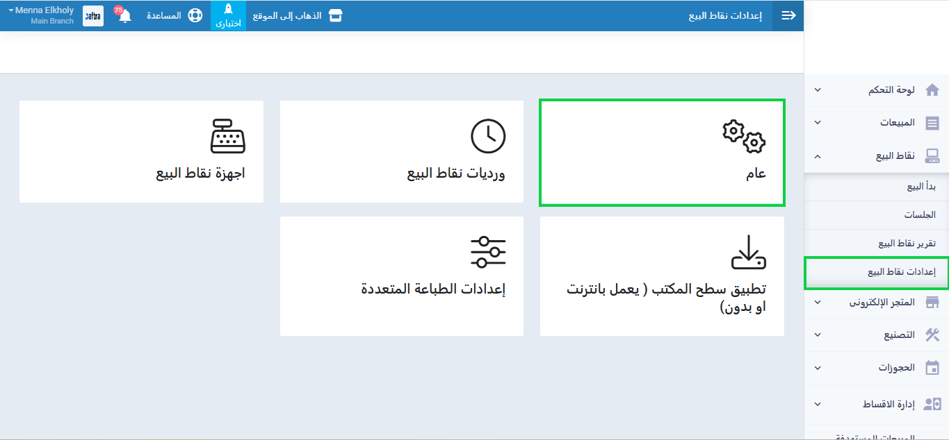 اضغط على “إعدادات نقاط البيع” المنسدلة عن “نقاط البيع” بالقائمة الرئيسية ثم اضغط على “عام”