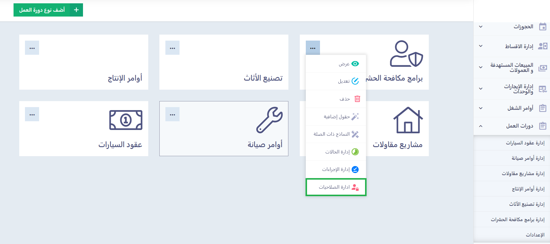 كيفية إدارة صلاحيات نوع دورة العمل