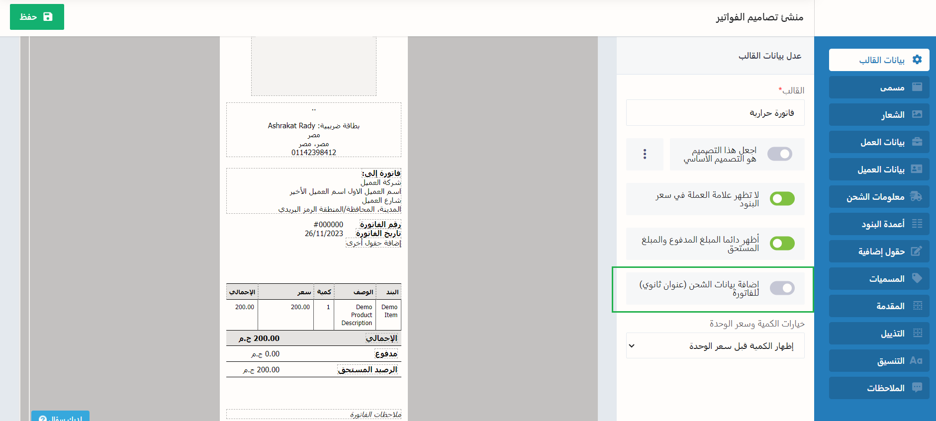 - إضافة بيانات الشحن (عنوان ثانوي) للفاتورة: عند تفعيلها يظهر عنوان شحن العميل في الفاتورة.