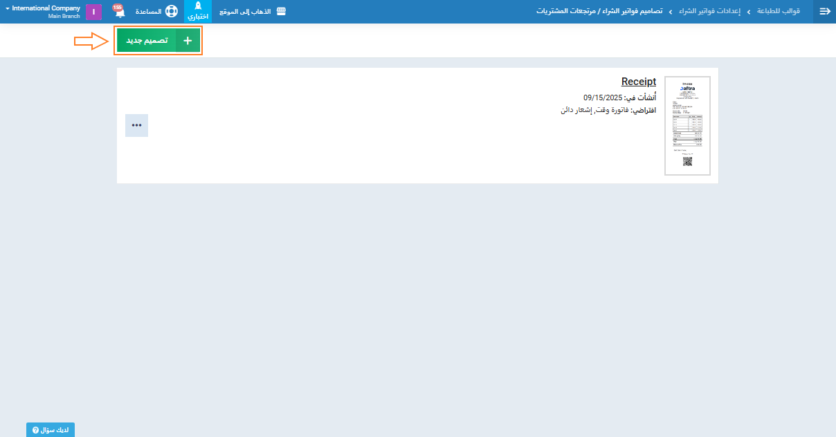 للذهاب إلى قوالب الفواتير للتعديل على التصميمات اضغط على “إعدادات المشتريات” المنسدلة عن “المشتريات” بالقائمة الرئيسية للذهاب إلى”تصاميم فواتير الشراء / مرتجعات المشتريات“.