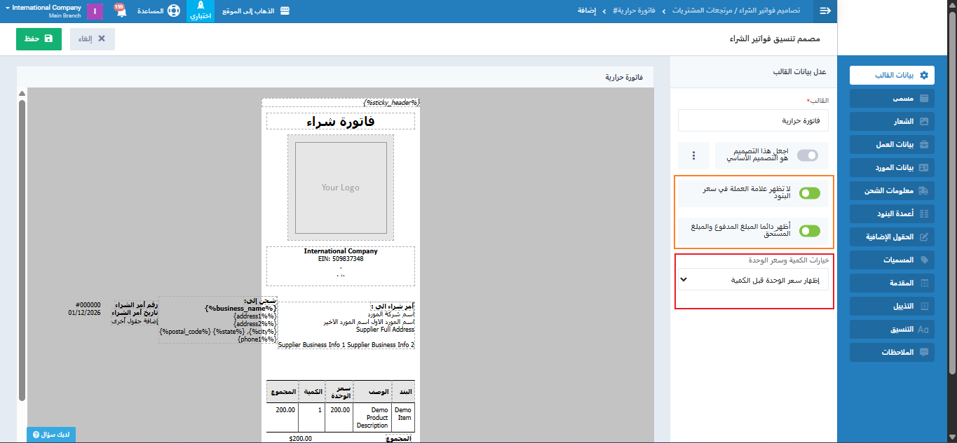 - اظهر دائمًا المبلغ المدفوع والمبلغ المستحق: تحكم من خلالها في إظهار المبالغ المستحقة المستوجب دفعها والمبالغ المدفوعة في الفواتير,