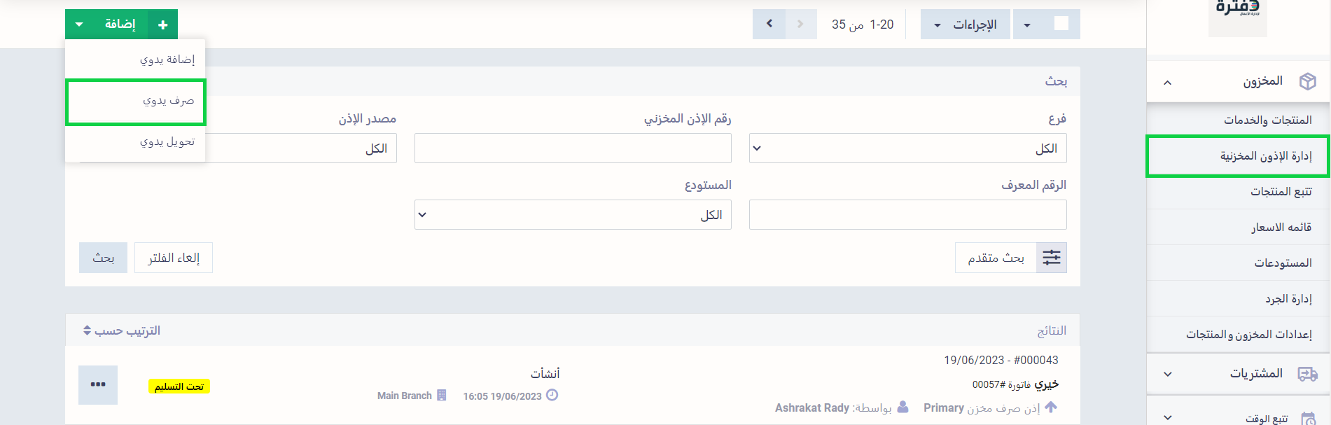سنصرف كمية من المنتج لتقليل كميته في المخزون عن الحد المراد التنبيه عند الانخفاض عنه من خلال الضغط على زر “إضافة صرف يدوي” الموجود في شاشة “إدارة الأذون المخزونية” المنسدلة عن “المخزون” بالقائمة الرئيسية.