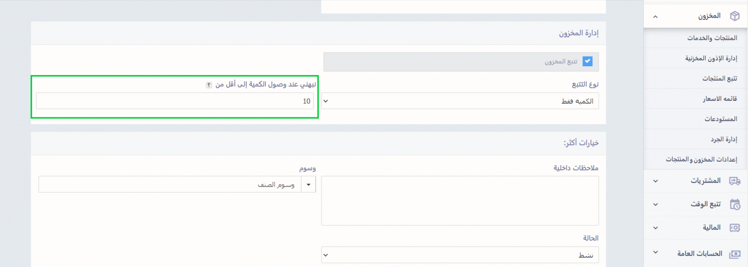 قم بتحديد العدد الذي ترغب أن يتم إرسال إشعار لك إن انخفض المخزون عنه في خانة “نبهني عند وصول الكمية إلى أقل من” في هذا المثال حددنا الكمية بـ “10”.