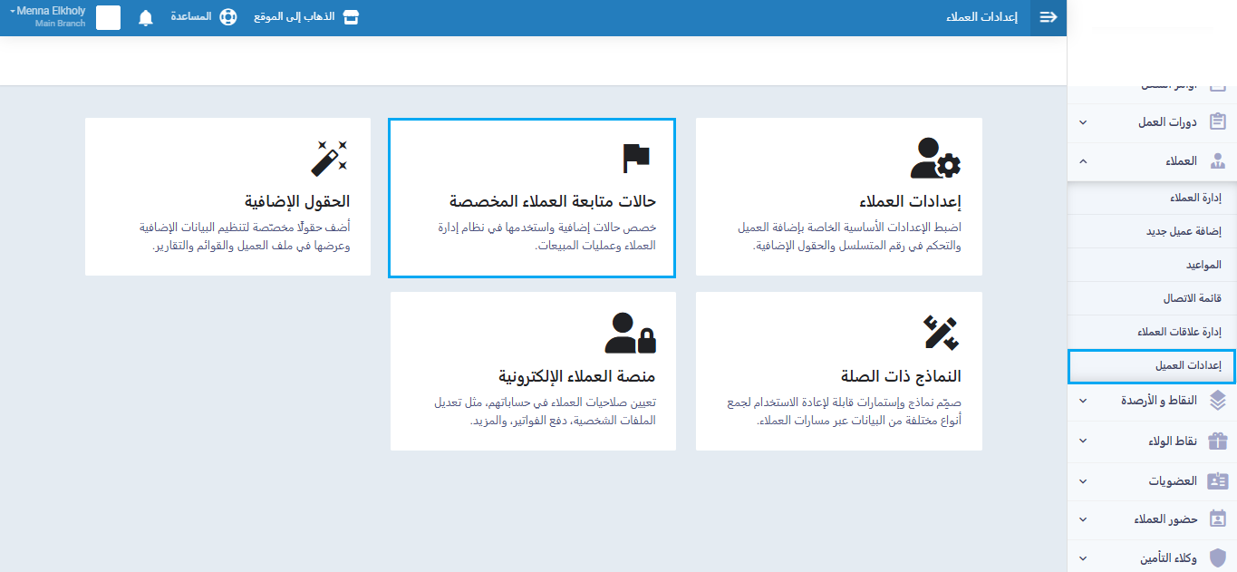 اضغط على “إعدادات العميل” المنسدلة عن “العملاء” بالقائمة الرئيسية، ثم اضغط على بطاقة “حالات متابعة العملاء المخصصة”.