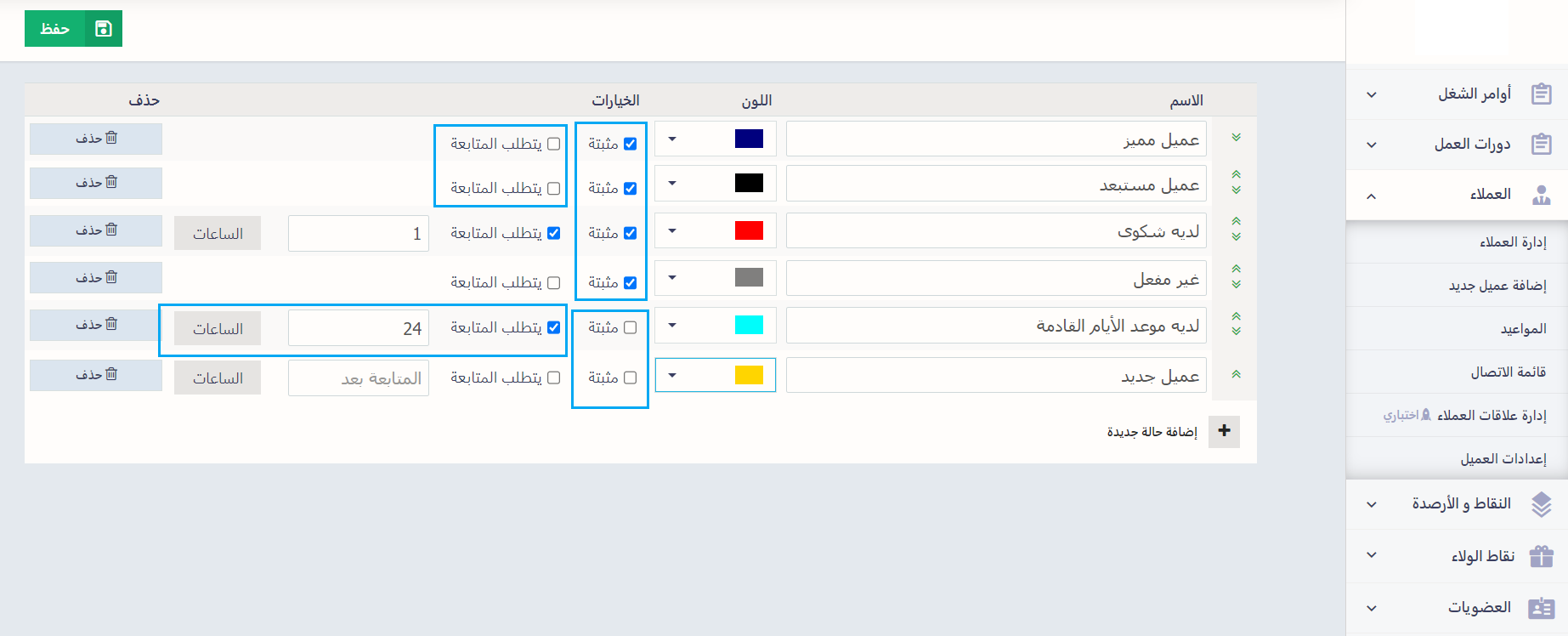 - يتطلب المتابعة: فعّل هذه الخاصية إن كانت الحالة مرتبطة بإجراء يستوجب تنبيه الأدمن أو الموظف وقت حلوله ✅ وادخل المدة اللازم المتابعة عندها في حقل “المتابعة بعد”.