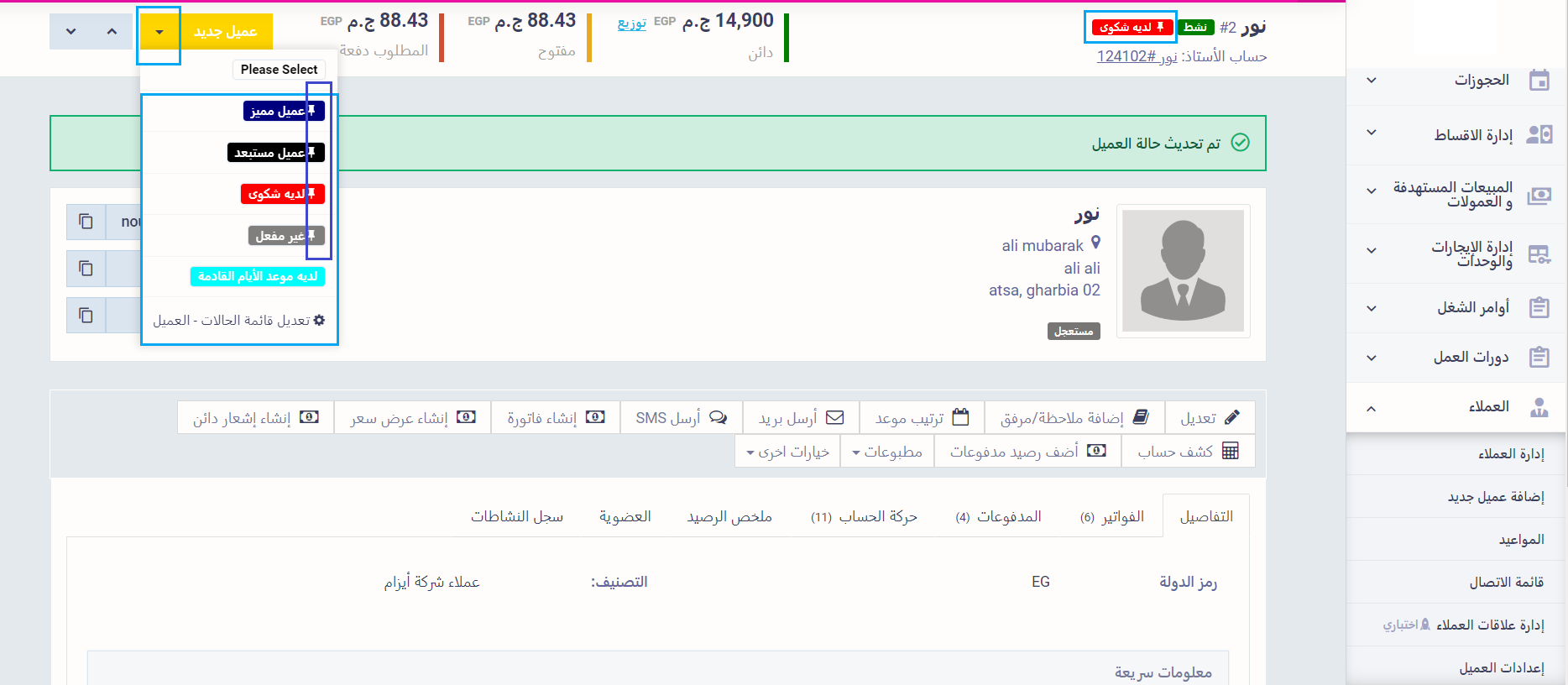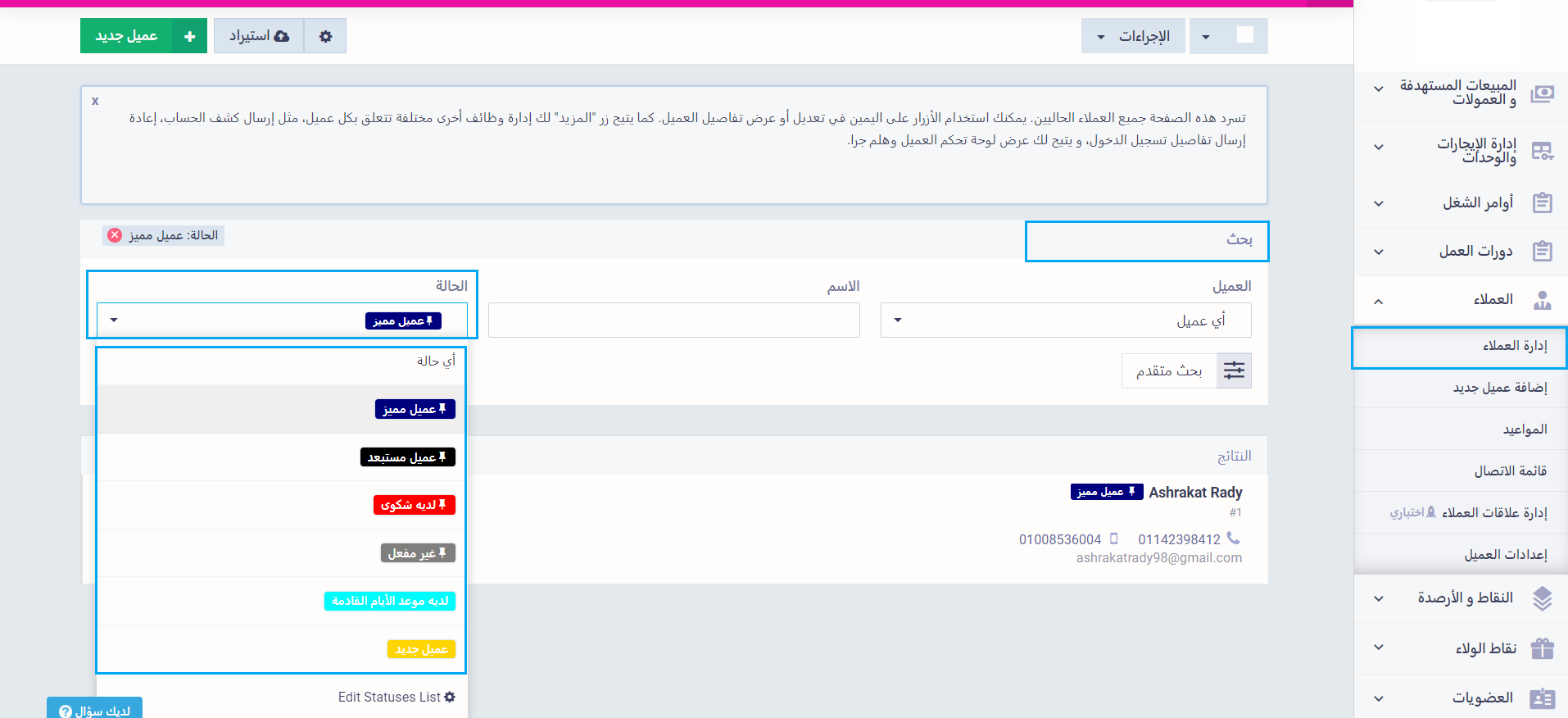اضغط على “إدارة العملاء” المنسدلة عن “العملاء” بالقائمة الرئيسية، وتوجه للجزء الخاص بالبحث واضغط على حقل الحالة واختر حالة العملاء التي تود البحث عنها من القائمة المنسدلة ثم اضغط على زر “حفظ” ليتاح لك متابعة العملاء أصحاب هذه الحالة بسهولة.