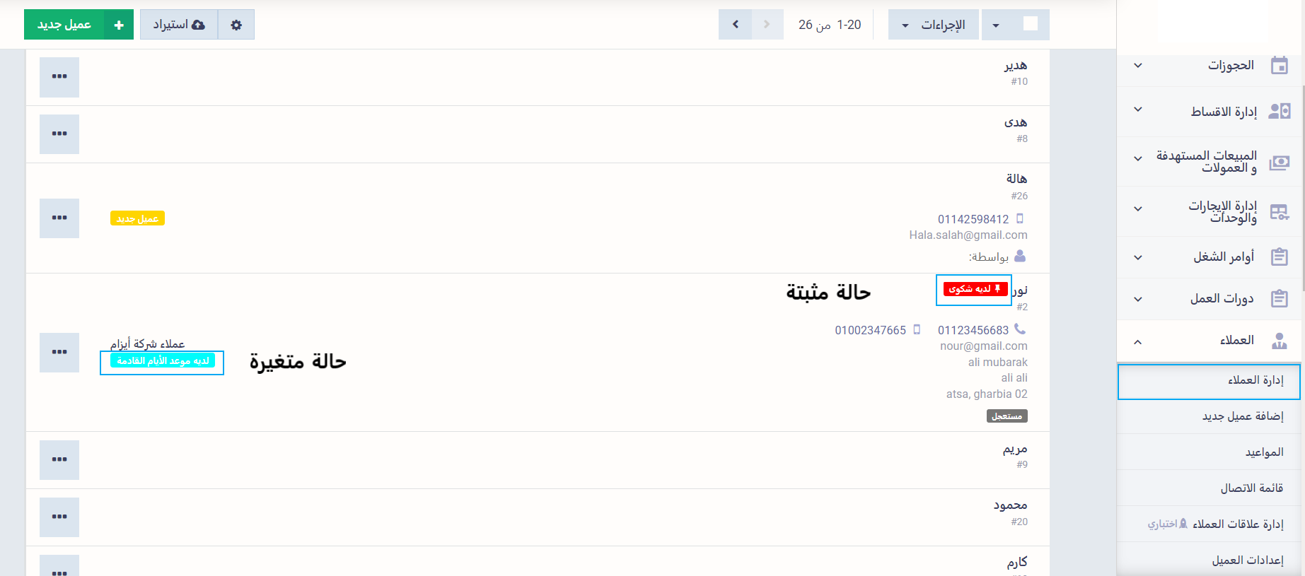 يمكنك تمييز العملاء بسهولة من خلال إضافة حالات مختلفة، كما تُستَخدم الحالات في عملية البحث لفلترة العملاء، ويمكنك كذلك ربطها بموعد يتطلب متابعة العميل عنده، وتنبيهك إن حان الوقت من خلال الإشعارات.