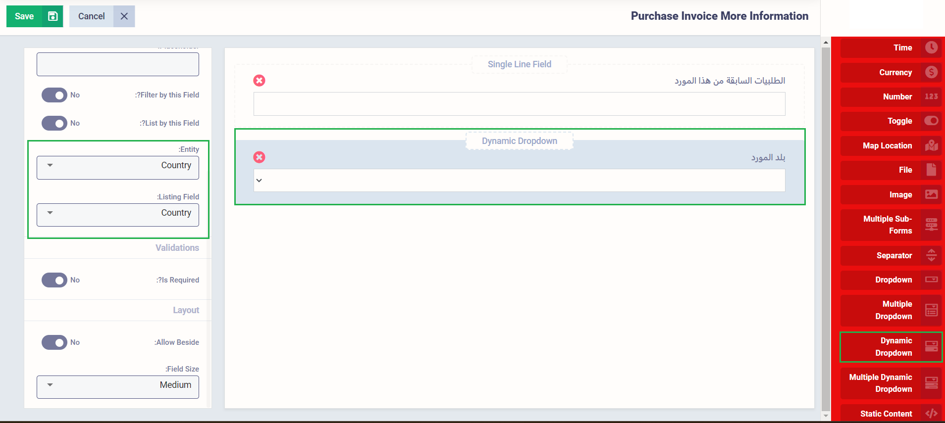بالإضافة لخصائص الحقول السابقة، هناك الحقول الديناميكية التابعة للقوائم المنسدلة، والتي ترتبط بقاعدة البيانات