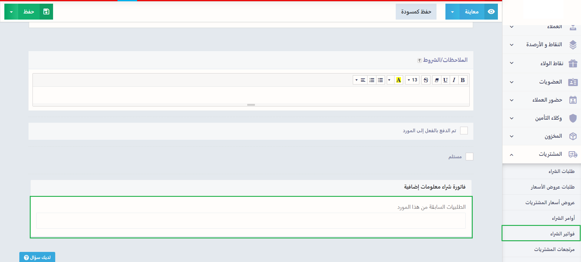 كيفية إضافة حقول إضافية لفواتير الشراء