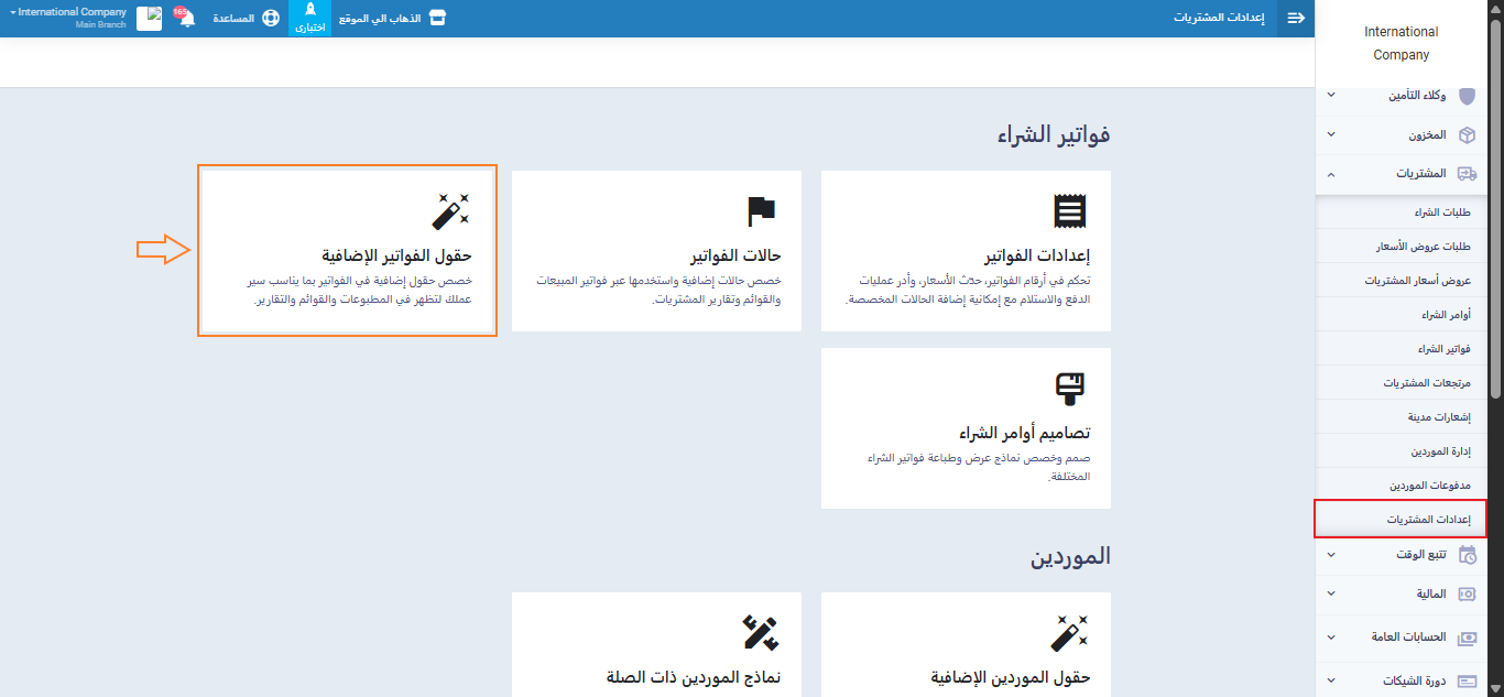 أما إن أردت إضافة حقل ما إلى فواتير الشراء فيمكنك التوجه إلى “إعدادات فواتير الشراء” المنسدلة عن “المشتريات” بالقائمة الرئيسية. ثم اضغط على “حقول إضافية”.