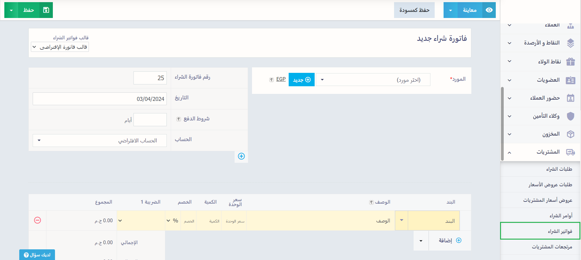 يظهر إليك الآن جزء من الشاشة الافتراضية لفاتورة الشراء، والتي يمكنك الاكتفاء بها إن لم تدعوك الحاجة لإنشاء حقل جديد.