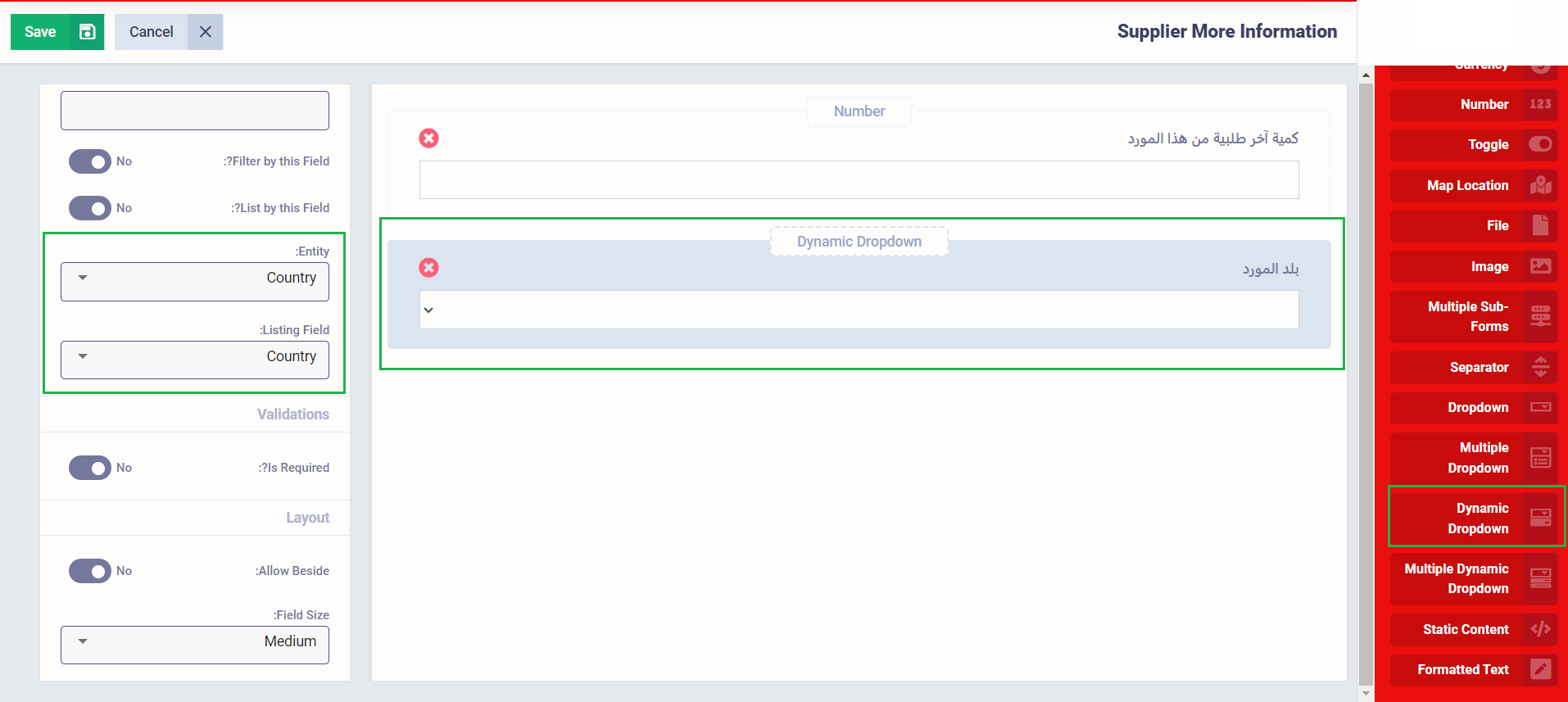 يمكنك إضافة الحقول الديناميكية والتي ترتبط بقاعدة بيانات منشأة تلقائيًَا من النظام كقاعدة بيانات الدول أو بقاعدة بياناتك أنت كالعملاء المضافين منك على السيستم