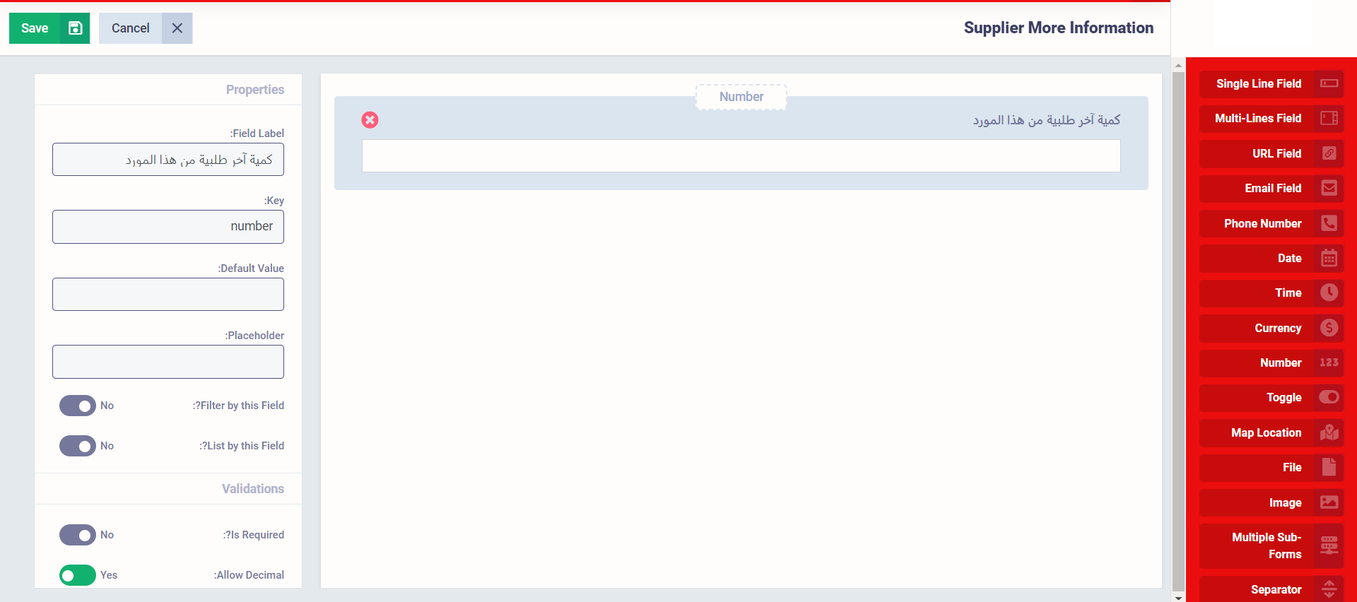 تظهر لك قائمة بأنواع الحقول المتاح إضافتها، كل ما عليك هو السحب والإفلات وضبط الخصائص كما هو موضح.