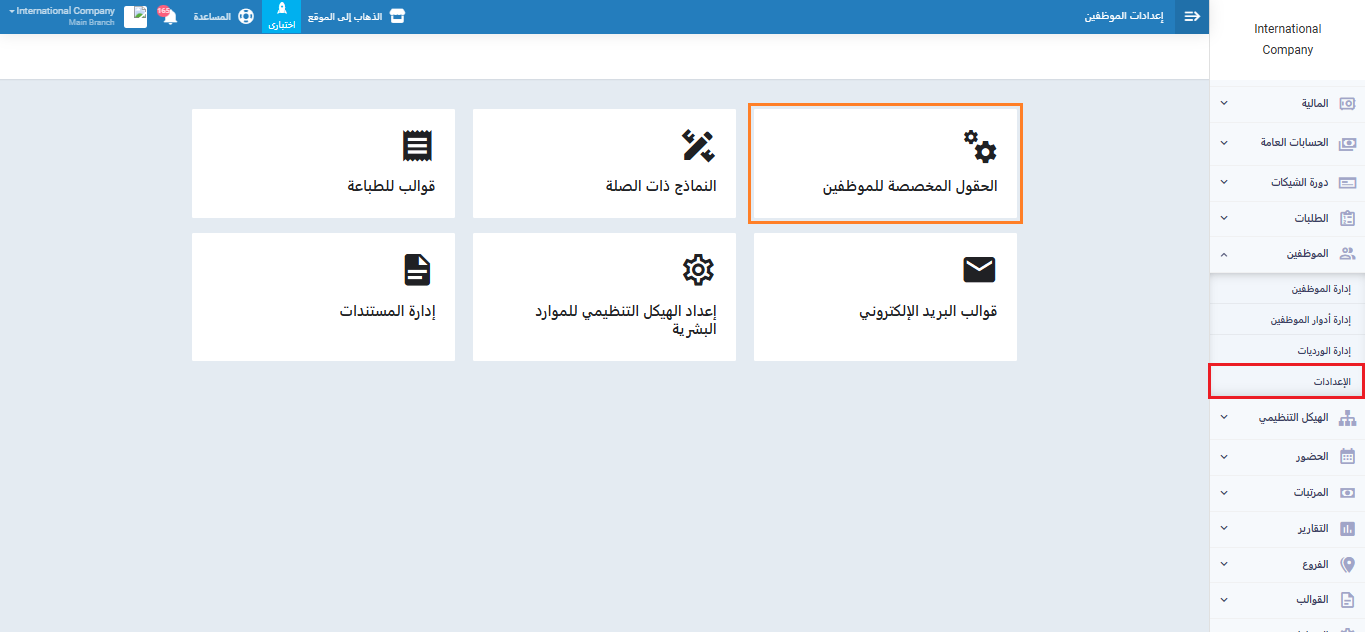 أما إن أردت إضافة حقل ما عليه فيمكنك التوجه إلى “الإعدادات” المنسدلة عن “الموظفين” بالقائمة الرئيسية. ثم اضغط على “حقول إضافية”.