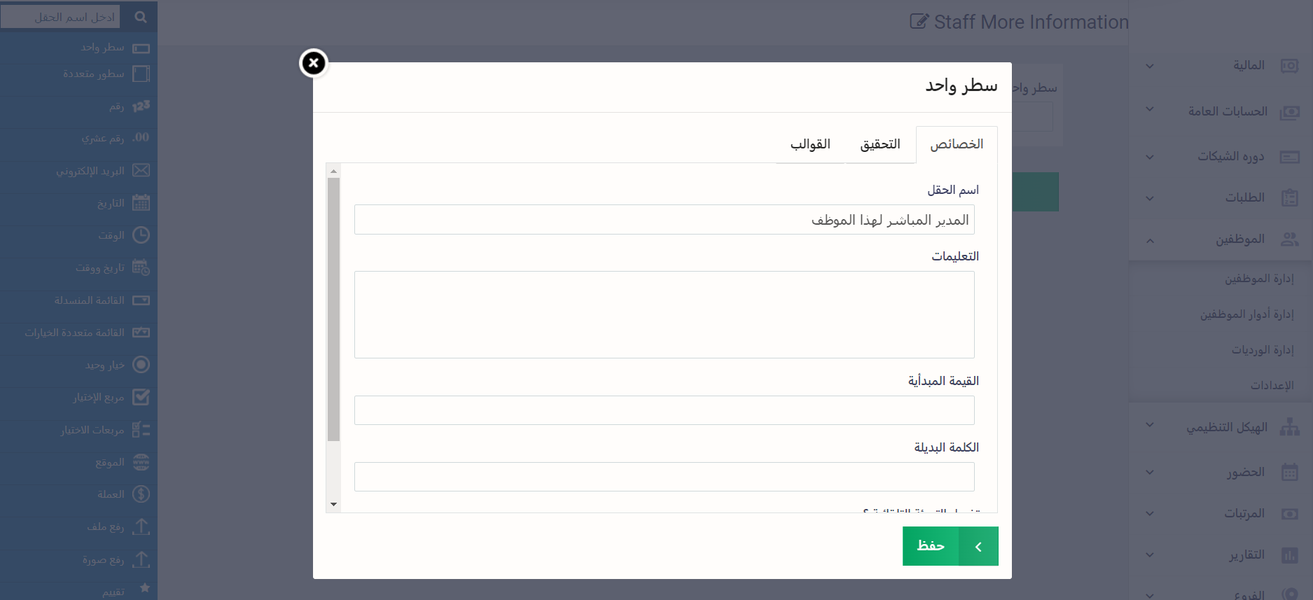 القيمة المبدئية: يمكنك إضافة قيمة ما تظهر تلقائيًا في الحقل عند إضافة أي ملف شخصي لموظف ، تفيد إن كان هناك قيمة متكررة، كأن تضيف اسم مورد يغلب أن تكون تعاملاتك معه.