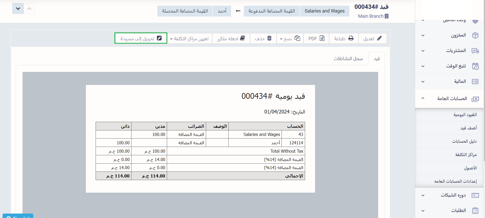 بعد تأكيد القيد المسودة يمكنك إرجاعه مرة أخرى بالضغط على زر “تحويل إلى مسودة” يمكنك كذلك تحويل أي قيد يدوي إلى مسودة ولكن لا يمكنك تحويل قيد تم إنشائه آليًا مسودة.