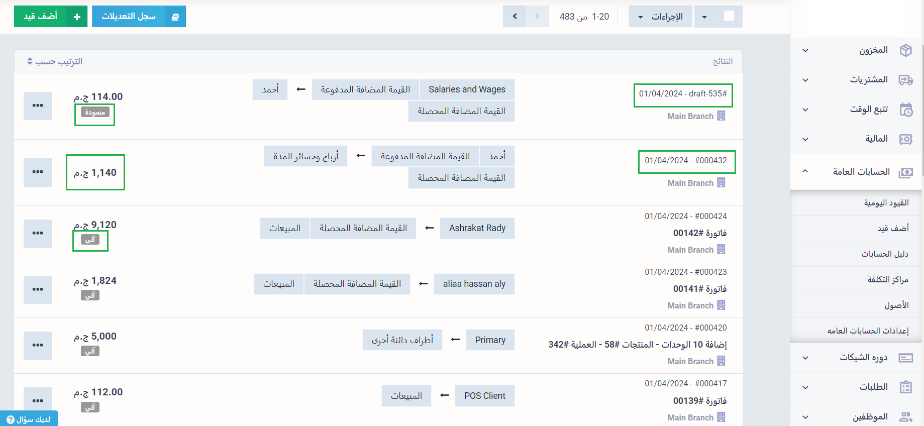 اذهب إلى “القيود اليومية” المنسدلة عن “الحسابات العامة” لإنشاء قيد يدوي