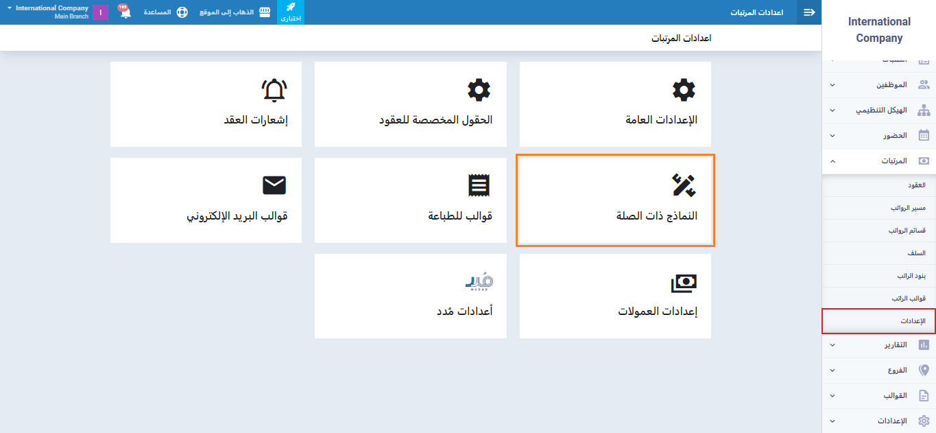 اضغط على “الإعدادات” المنسدلة عن “المرتبات” بالقائمة الرئيسية واضغط على بطاقة “النماذج ذات الصلة”.