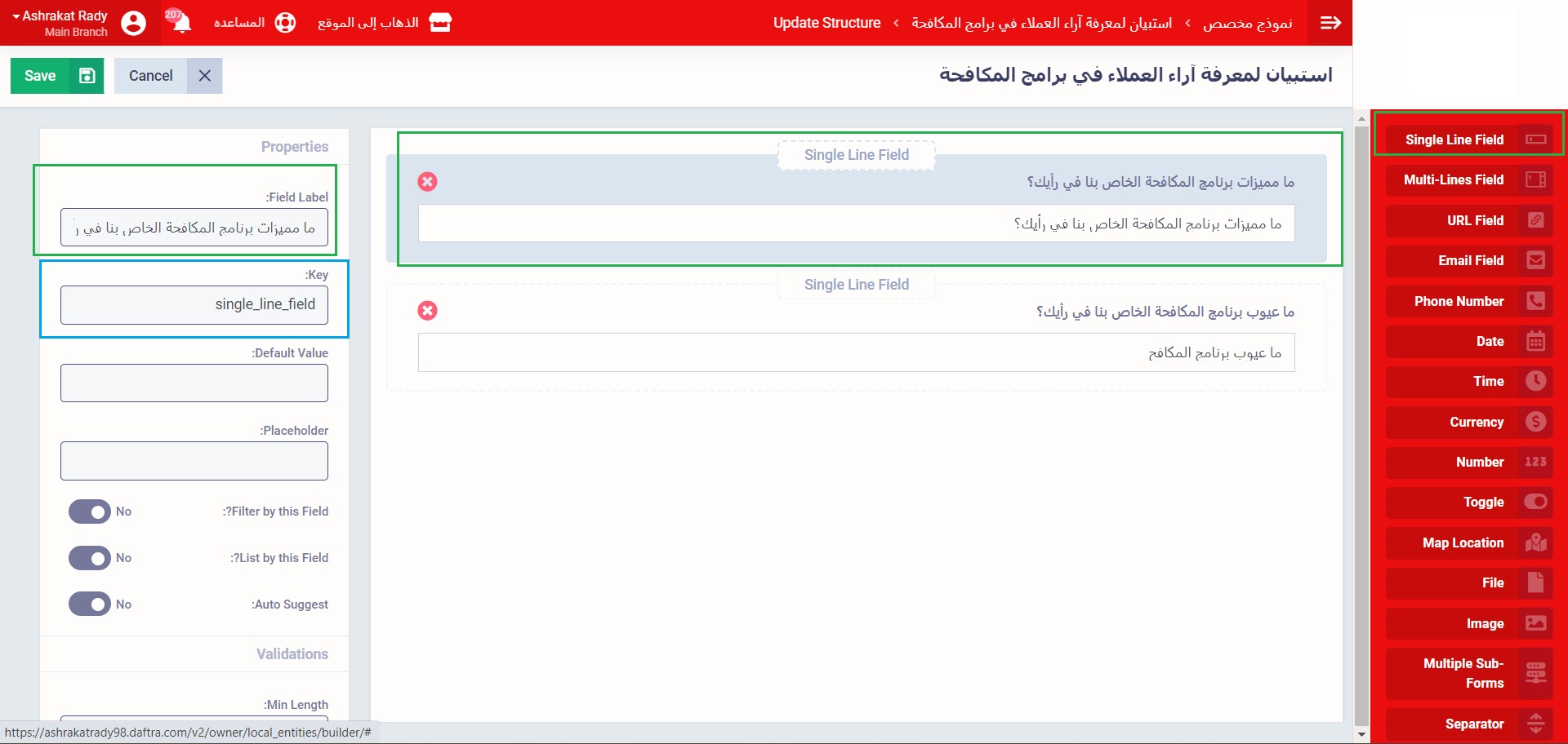 ينبغي أن يكون مفتاح الحقل (Key) مميز لهذا الحقل ومختلف عن مفاتيح أي حقل آخر في نفس النموذج، ويكون الحقل عبارة عن رقمين أو كلمات وحروف انجليزية، ويُفصل بين كل كلمة والأخرى أو كل رقم بالعلامة (_).