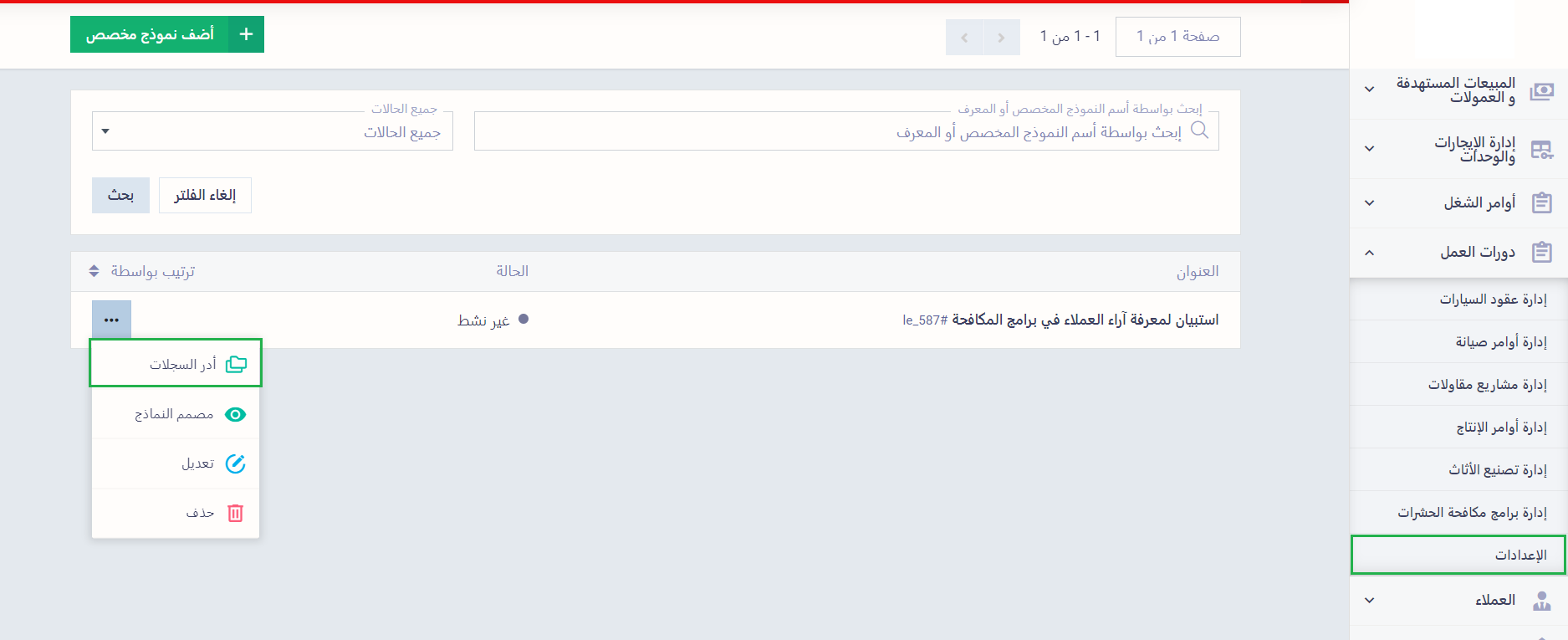 بعد الضغط على “أدر السجلات” أو على النموذج نفسه، ستظهر لك جميع النماذج الخاصة بنوع دورة العمل المرتبطة بهذا النموذج المخصص، مما يتيح لك استعراض بياناتها أو القيام ببعض الإجراءات.