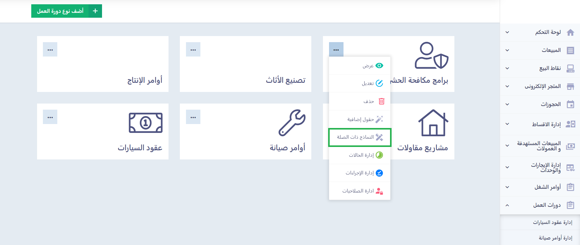 اضغط على الثلاث نقاط بجوار نوع دورة العمل المراد إنشاء نموذج مخصص لها ثم اضغط على “النماذج ذات الصلة”