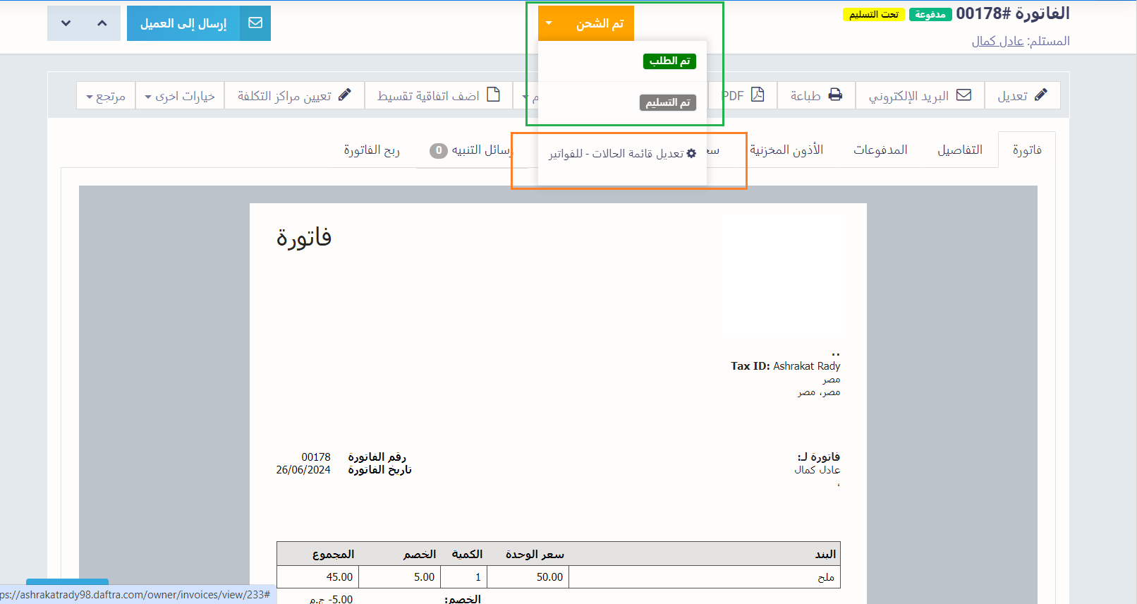 تظهر حالات التسليم والدفع كالتالي إلى جوار رقم الفاتورة.