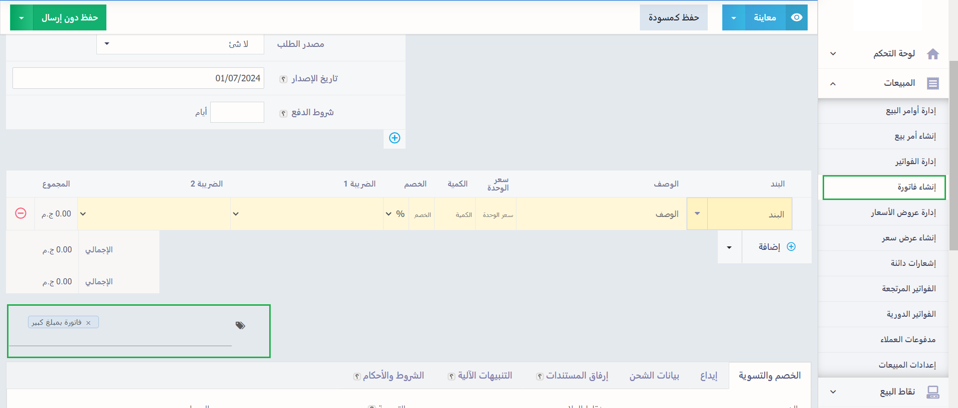 - تجد الوسم بجوار رقم الفاتورة والمستخدم الذي أنشأها، في المثال الحالي تجد الوسم: “فاتورة مميزة”.