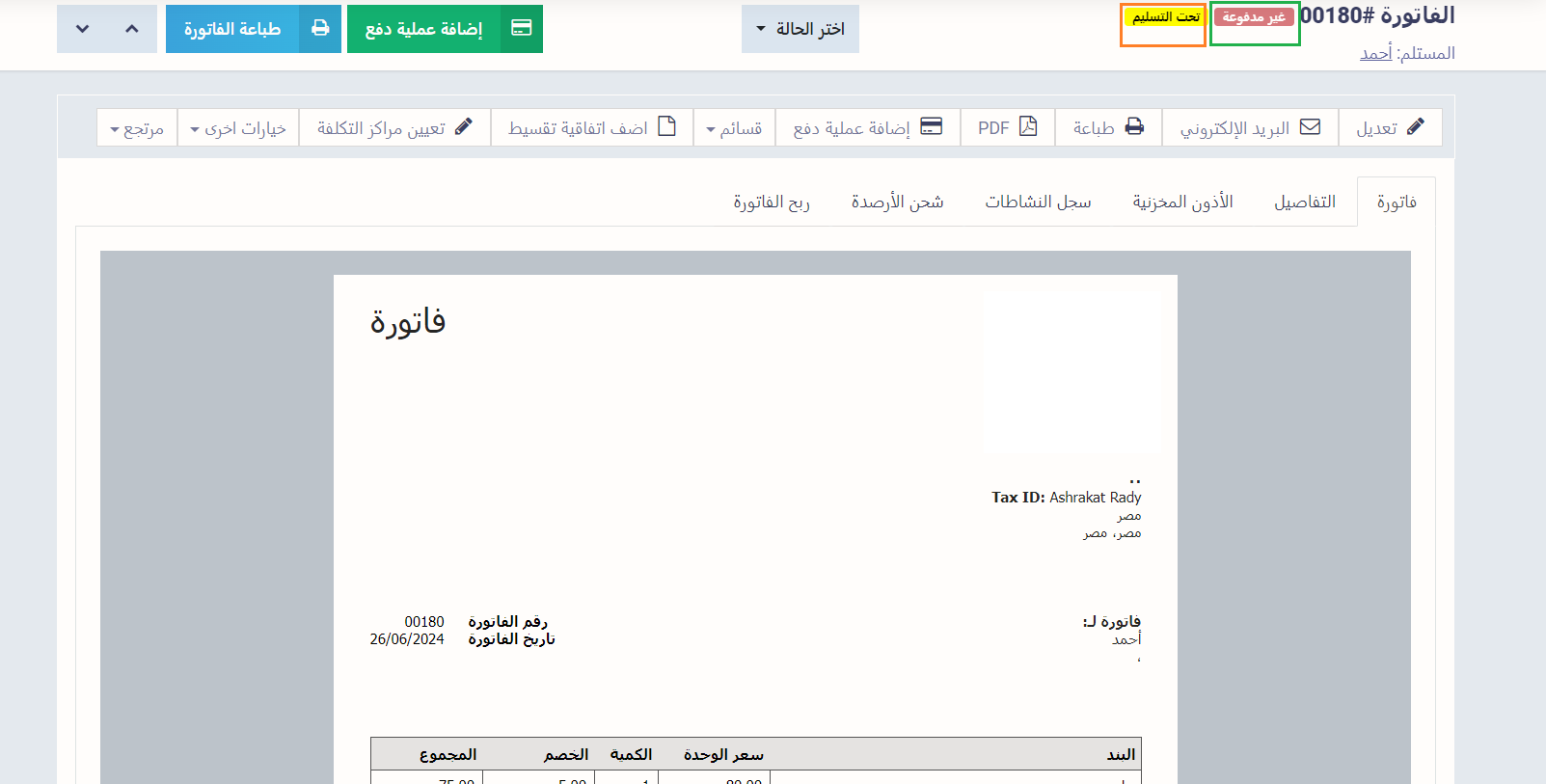 - وتظهر الحالات التلقائية على يسار الفاتورة. في المثال الحالي: حالة الدفع “غير مدفوعة” وحالة التسليم “تحت التسليم”.