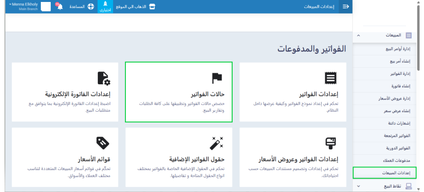 اضغط على “إعدادات المبيعات” المنسدلة عن “المبيعات” بالقائمة الرئيسية ثم اضغط على “حالات الفواتير”.