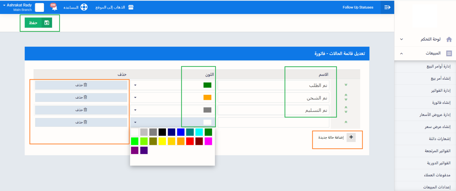 بعد إضافة الحالات اليدوية، تظهر لك في ملف الفاتورة ويمكنك اختيار الحالة المناسبة من القائمة المنسدلة، أو التعديل على قائمة الحالات اليدوية بالضغط على “تعديل قائمة الحالات للفواتير”.