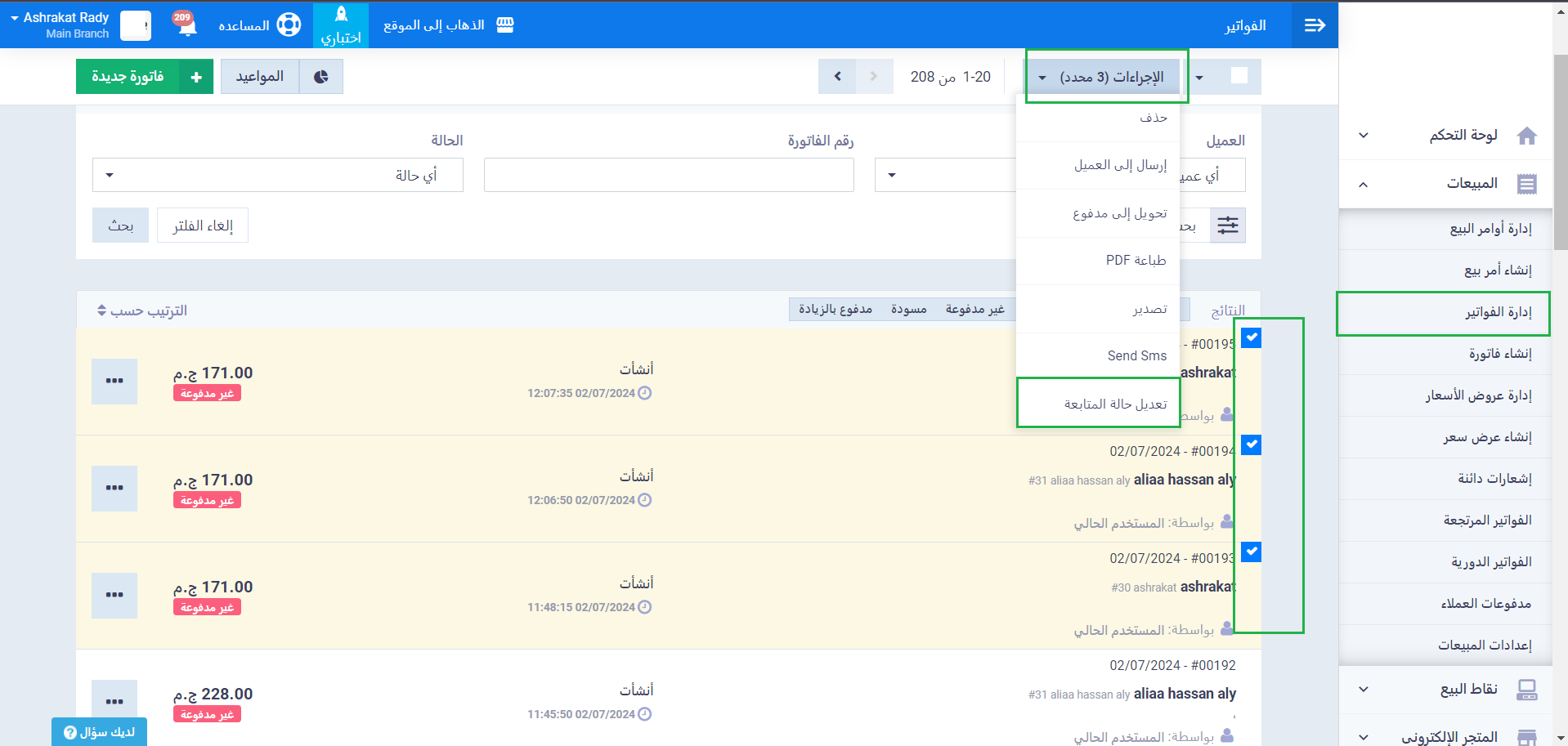 يمكنك تحديد أكثر من فاتورة وتغيير الحالة اليدوية للفواتير لهم معًا وذلك عن طريق الضغط على “إدارة الفواتير” المنسدلة عن “المبيعات” بالقائمة الرئيسية وتمييز الفواتير المراد تغيير حالتها ليظهر إلى جانبها علامة “✅“ ثم اضغط على زر الإجراءات واختر “تعديل حالة المتابعة” من القائمة المنسدلة.