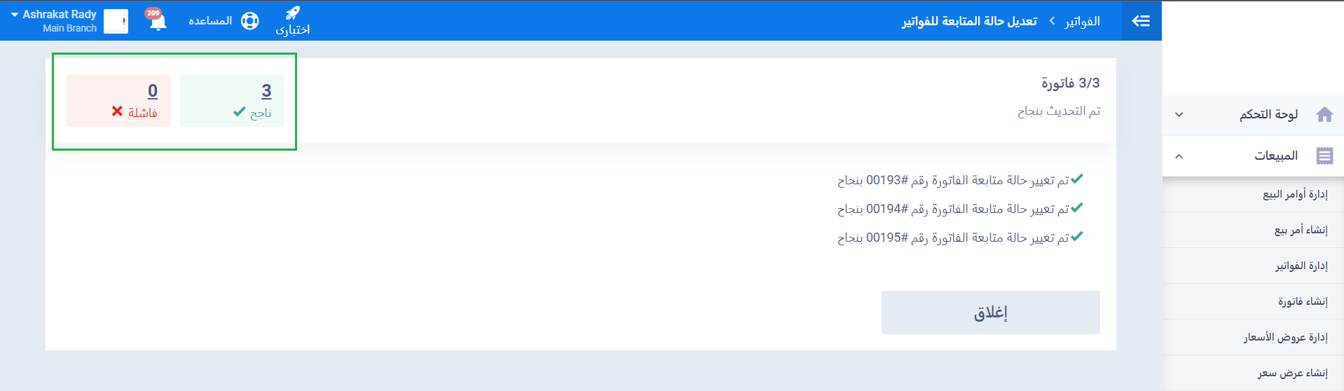 يتم تحديث حالات الفواتير المختارة ويظهر لك عدد الفواتير التي تم تحويلها بنجاح وتلك التي فشلت.