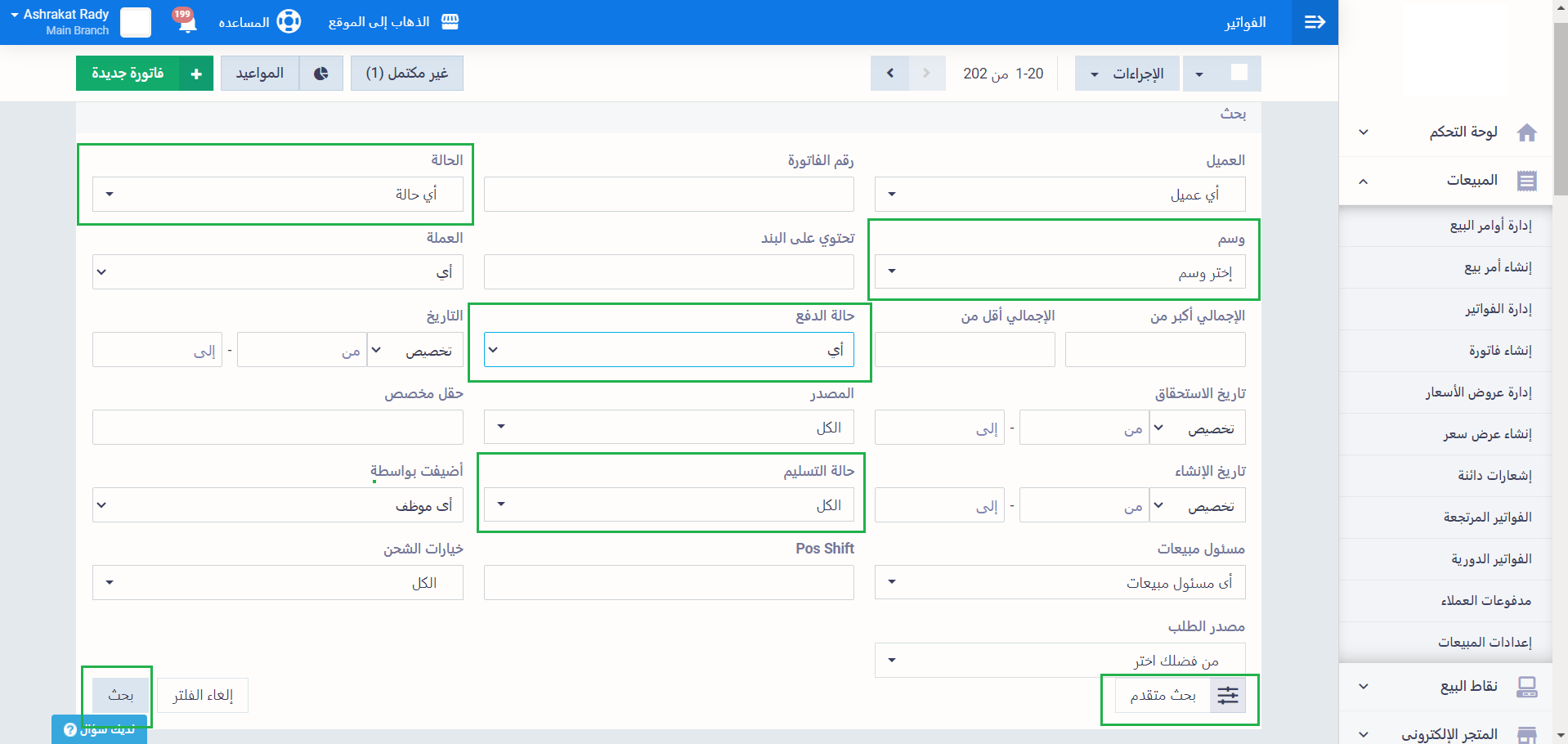 لفلترة الفواتير بناءً على الحالة أو الوسم، اذهب إلى “إدارة الفواتير” المنسدلة عن “المبيعات” بالقائمة الرئيسية، ثم اضغط على زر “بحث متقدم” لتوسيع خيارات البحث.