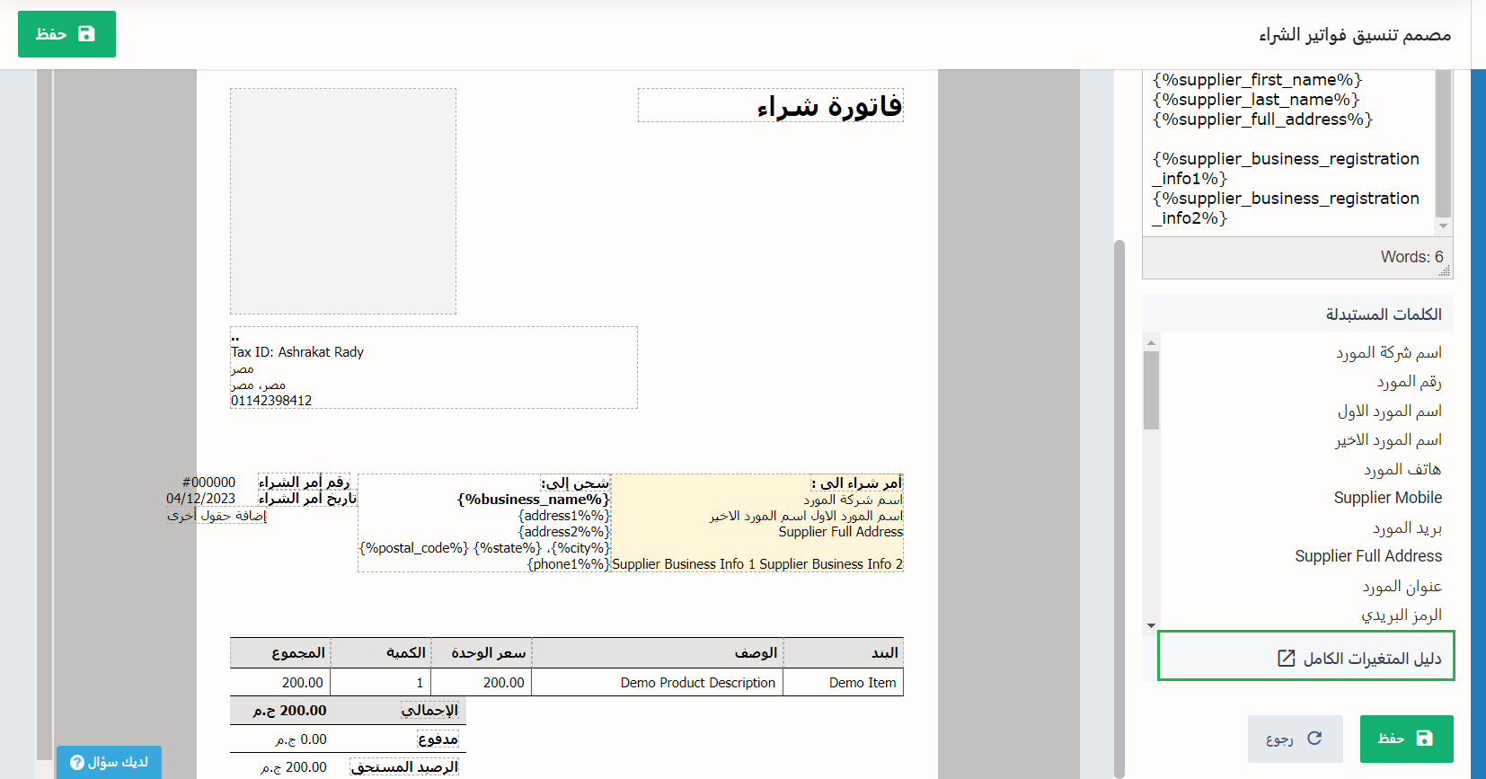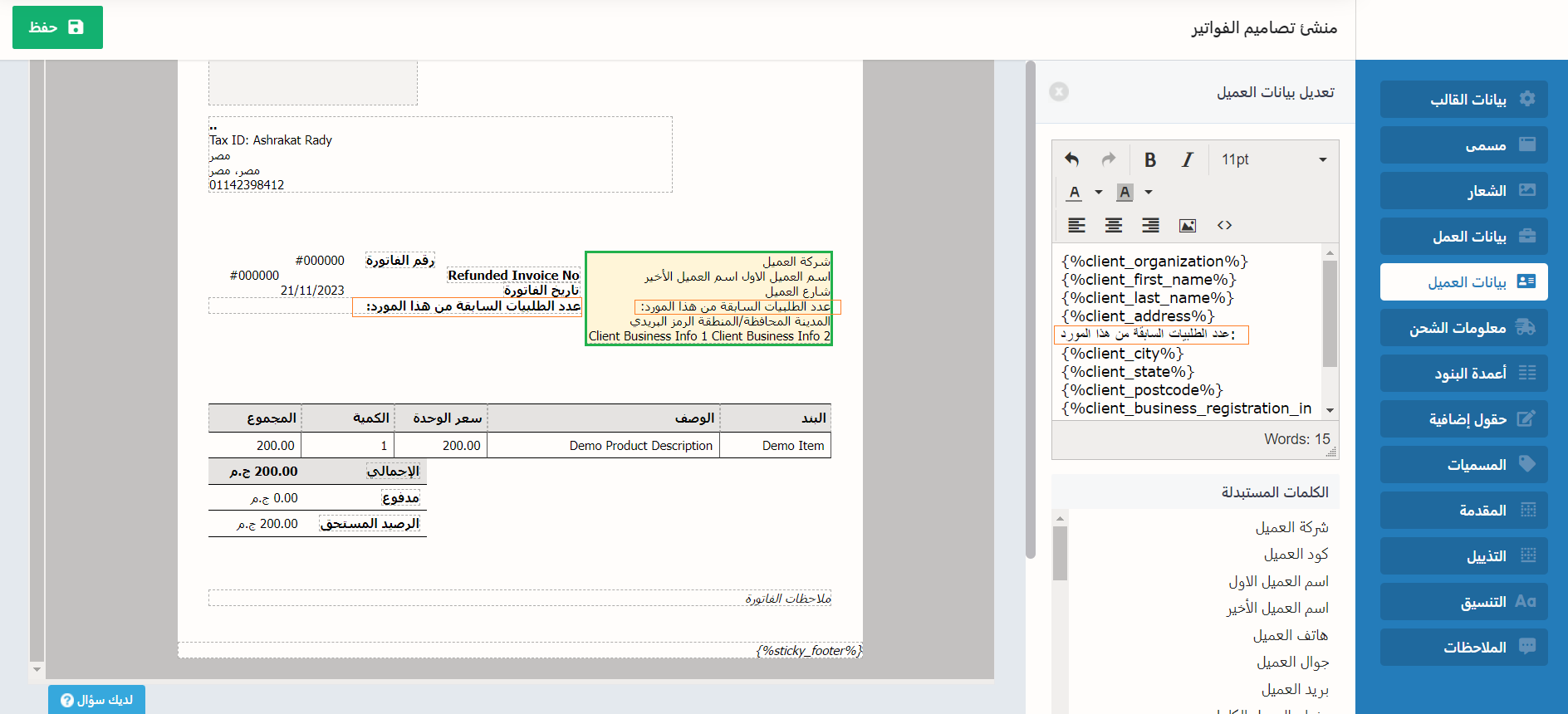 مع مراعاة أن بعض الخصائص كتلك التي أضفناها للقالب من دليل المتغيرات الكامل لا تعتبر حقل يتطلب إضافة بعض البيانات إنما يتم تفعيلها بعد حفظ الفاتورة وتُضبط تلقائيًا، مثل تفقيط إجمالي الفاتورة.