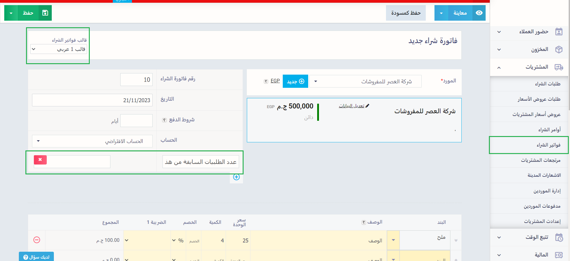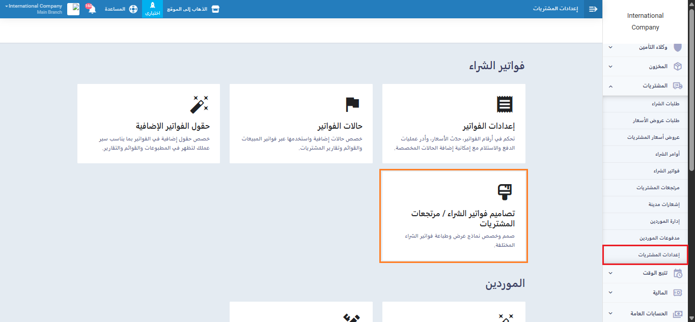 ويمكنك الوصول إليه من خلال الضغط على “إعدادات فواتير الشراء” المنسدلة عن “المشتريات” بالقائمة الرئيسية،