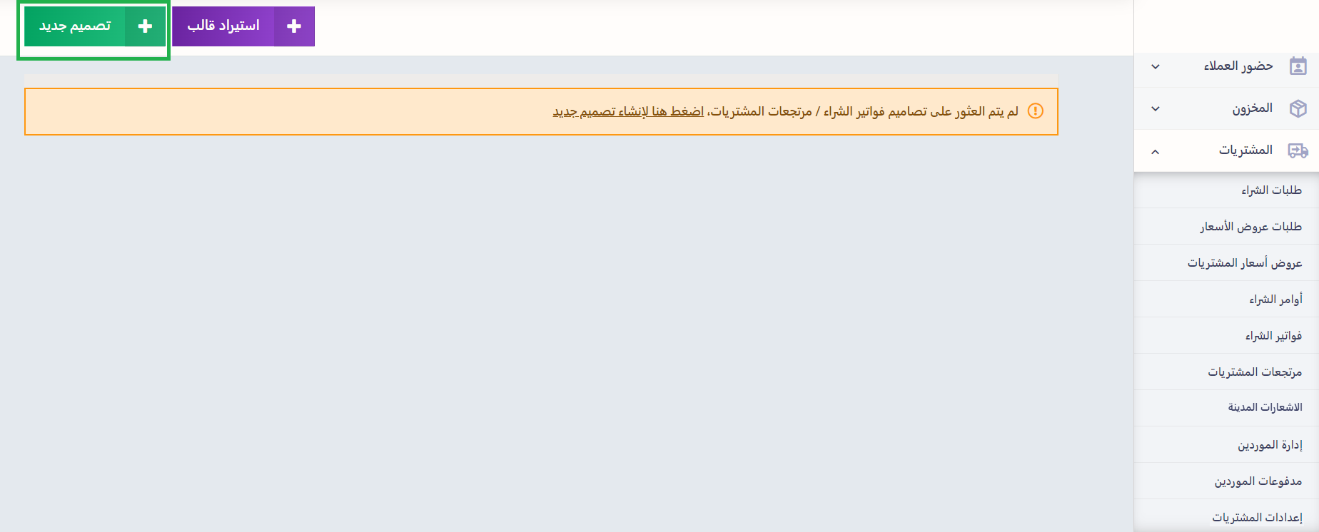 اضغط على “إعدادات فواتير الشراء” المنسدلة عن “المشتريات” بالقائمة الرئيسية واضغط على “تصاميم المشتريات “.