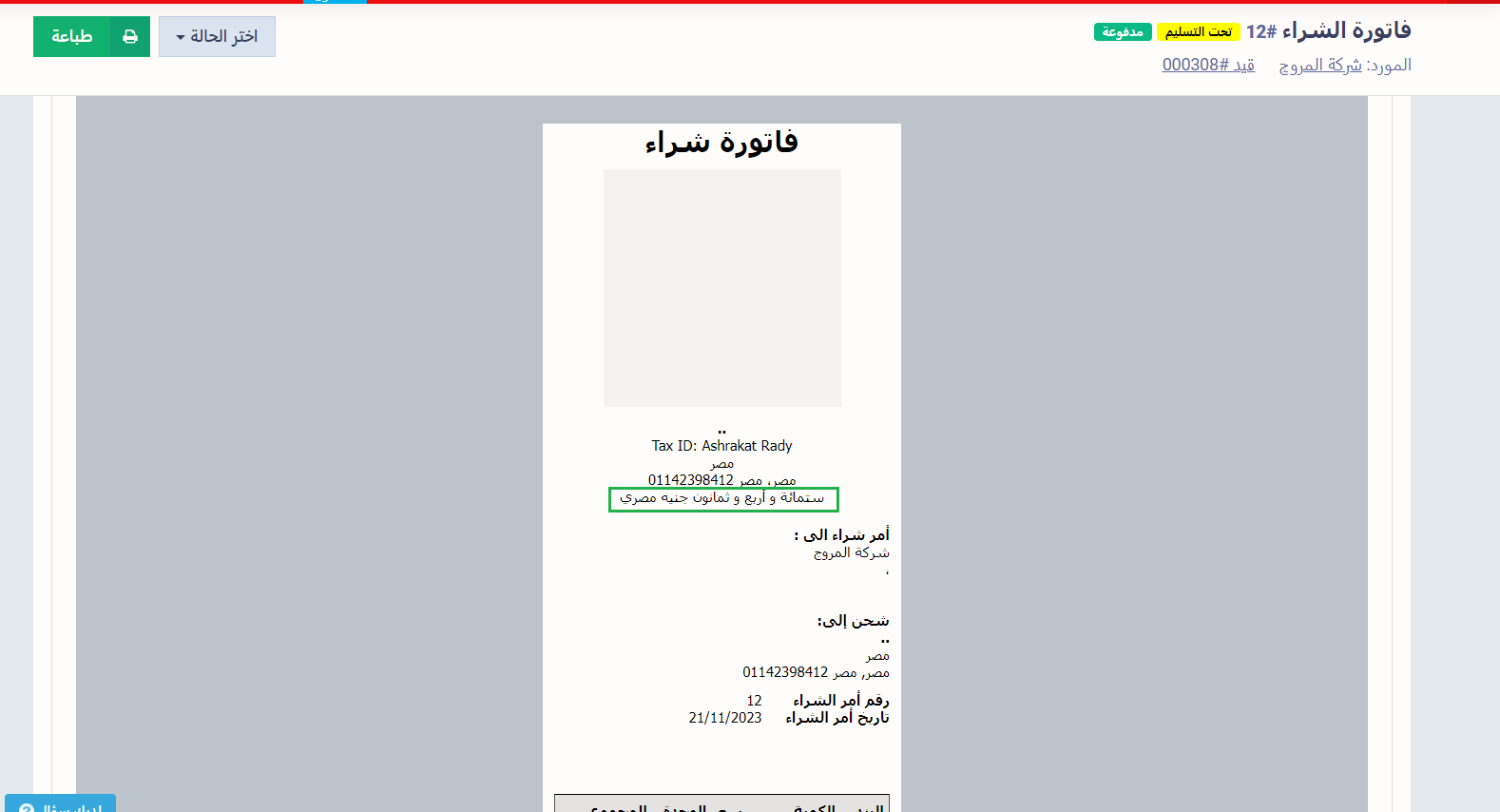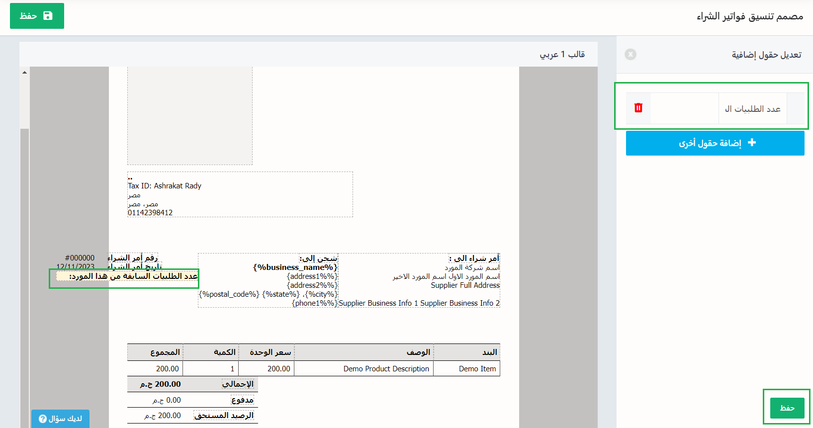 يظهر الحقل الإضافي عند اختيار القالب في الفواتير أو أيًا من مستندات دورة المشتريات تلقائيًا.