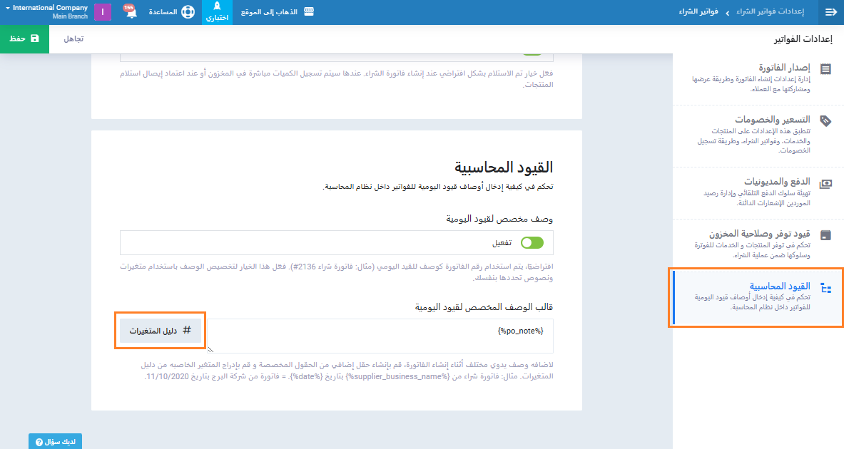 ثم الضغط على “إعدادات الفواتير” ثم الضغط على “دليل المتغيرات”.