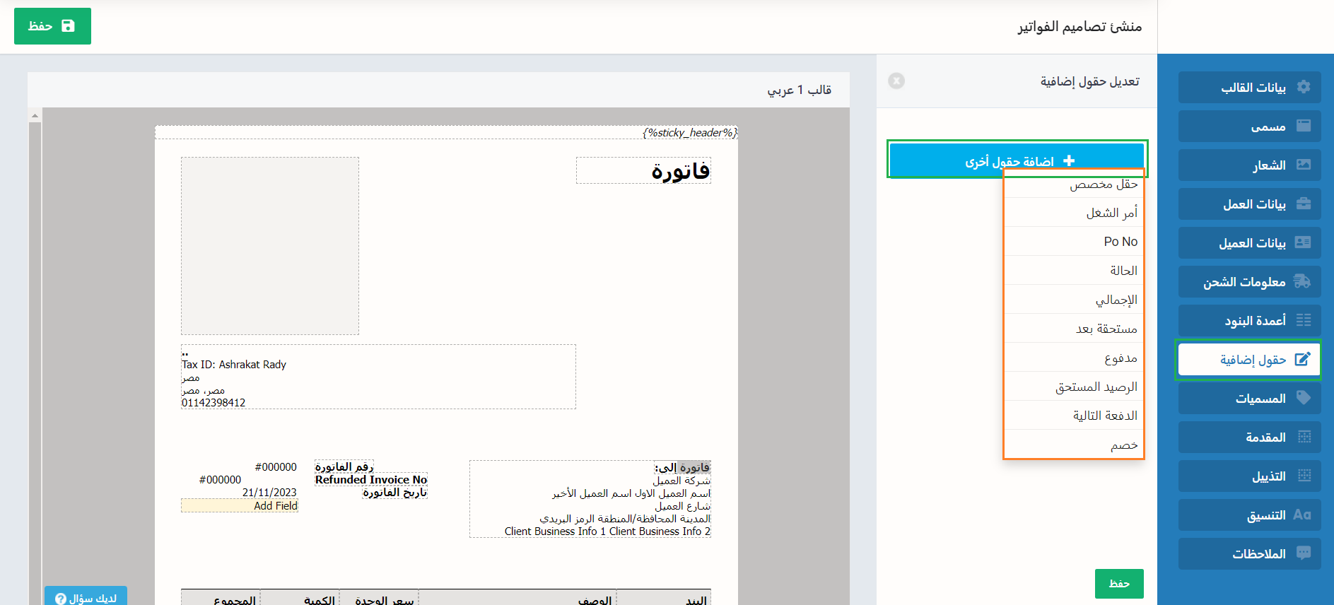 وسواء كنت تصدر الفاتورة عن القالب الأساسي أو أي قالب آخر، يمكنك إضافة حقل جديد يدويًا إن كانت الحقول الموجودة في الفاتورة لا تغطي كل ما تريده.